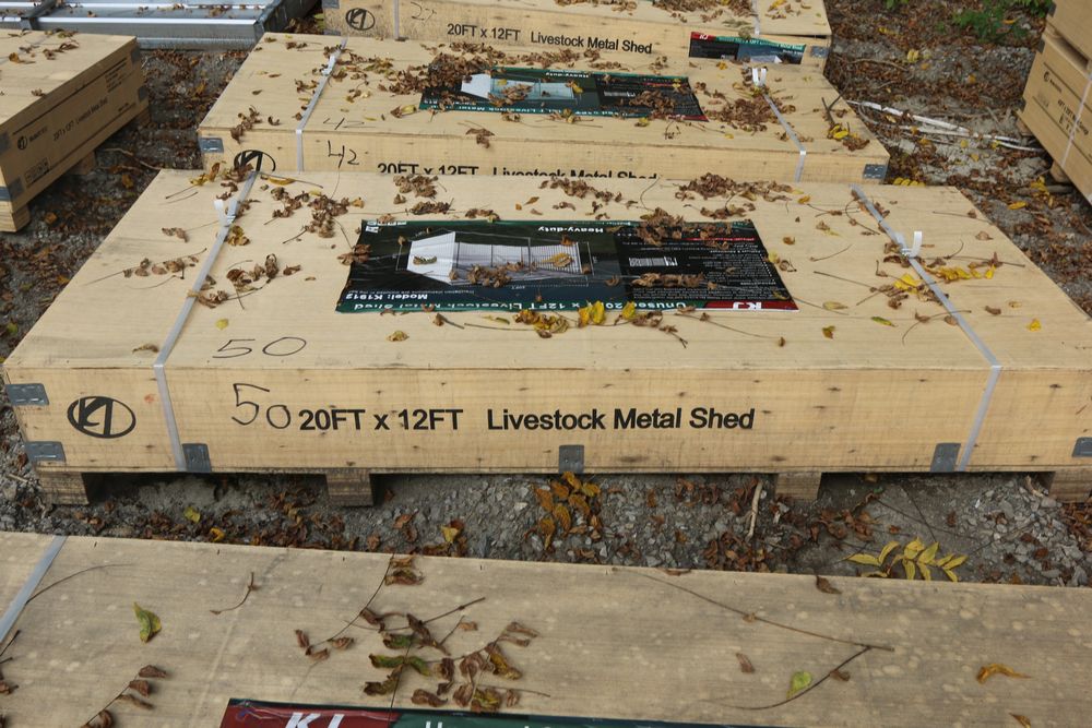 New livestock metal shed, 11'Tx9'Wx20'L, model K1912, in wood crate.