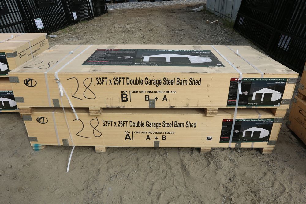 New 33ftx25ft double garage steel barn shed in wood crate, model K3325.