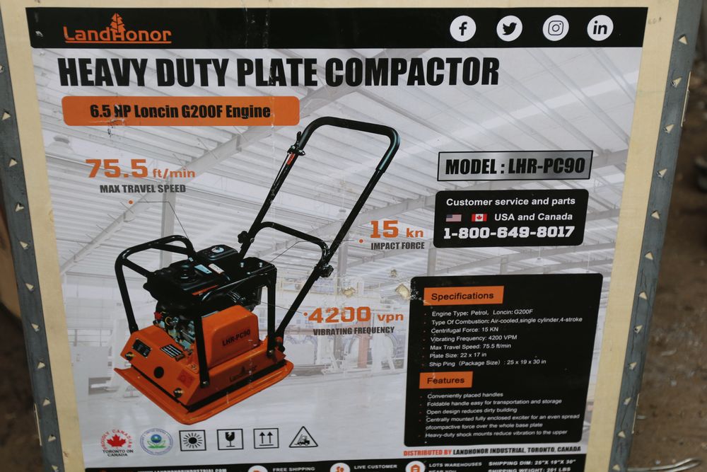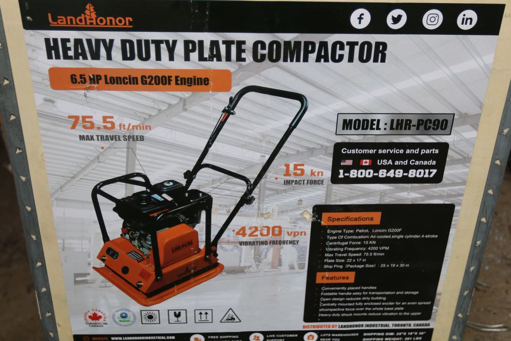 New 2025 LandHonor heavy duty plate compactor model LHR-PC90H, 6.5HP Loncin G200F engine. In original crate.