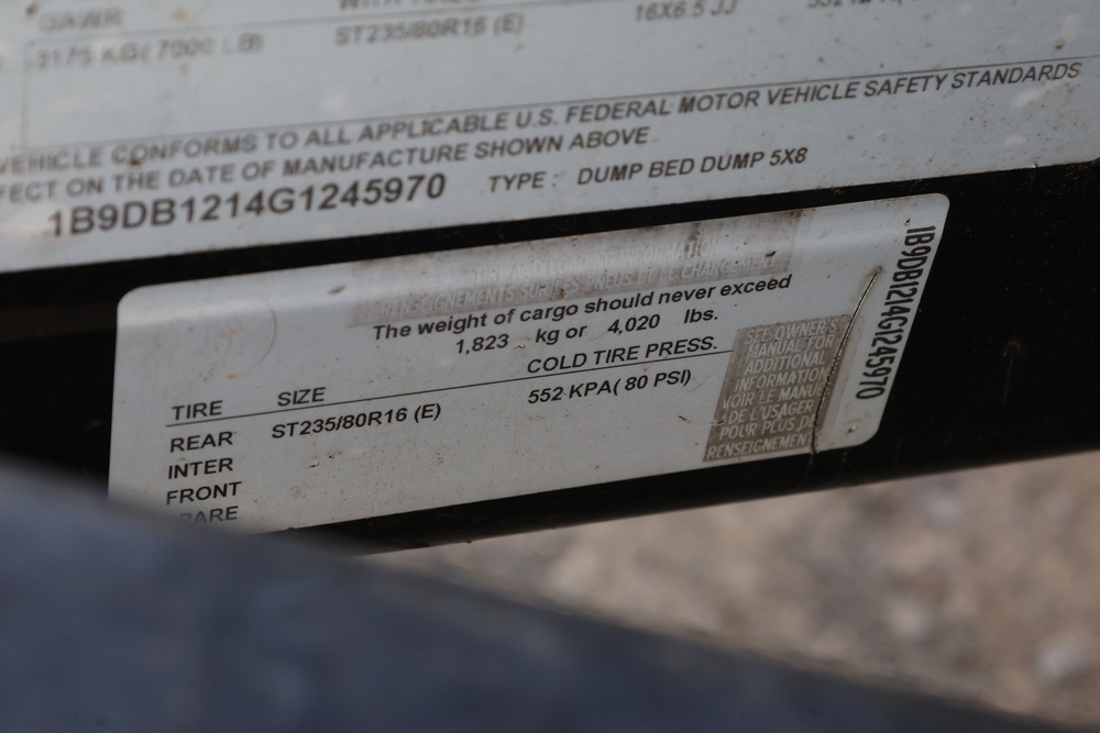 2016 Best Trailer model Dump 5x8 Trailer Dump 8' VIN: 1B9DB1214G1245970. Seller reports: Operates as intended. Seller ID # 769-19.