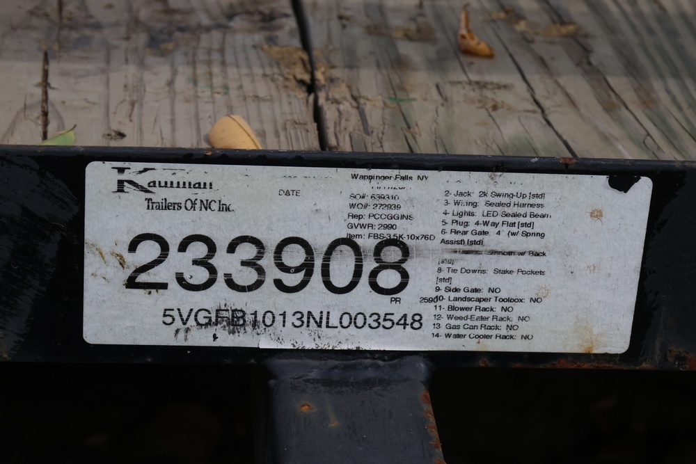 2021 Kaufman model Fbs3.5 Trailer 78" x 10' VIN: 5VGFB1013NL003548. Title and keys available. Seller ID # 020-19.