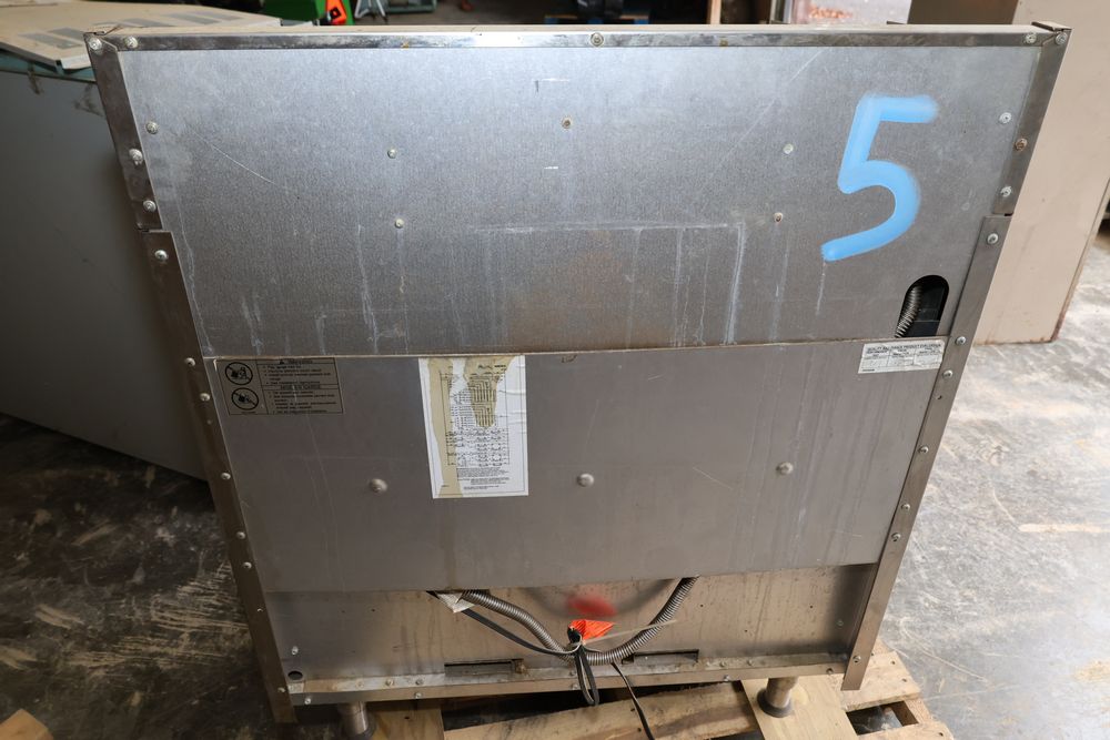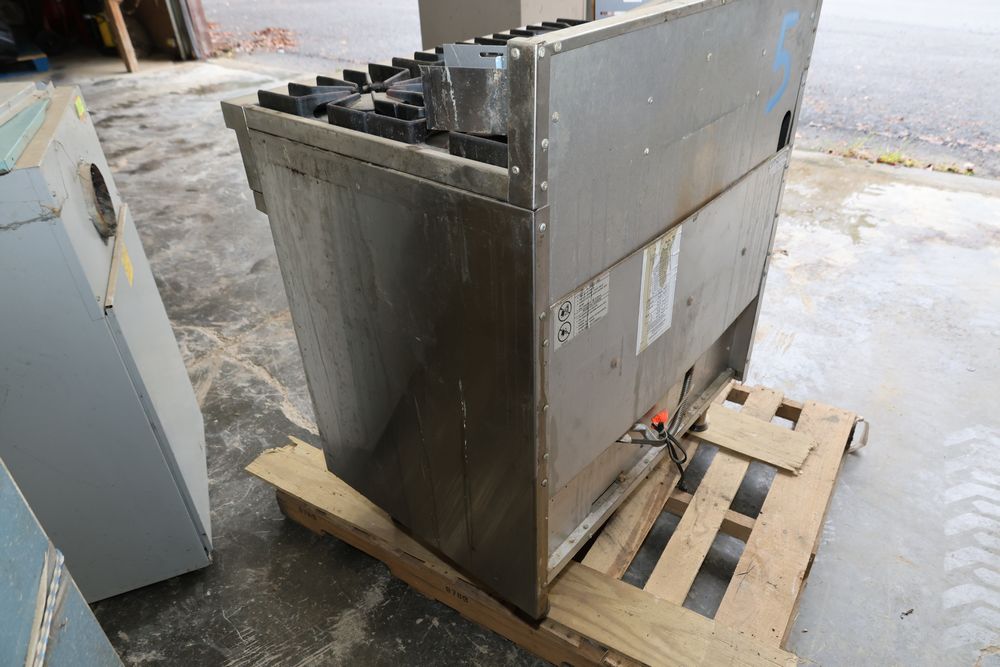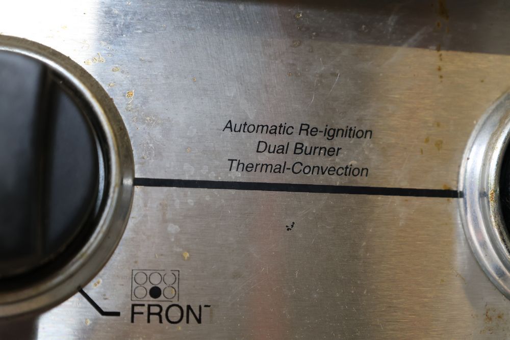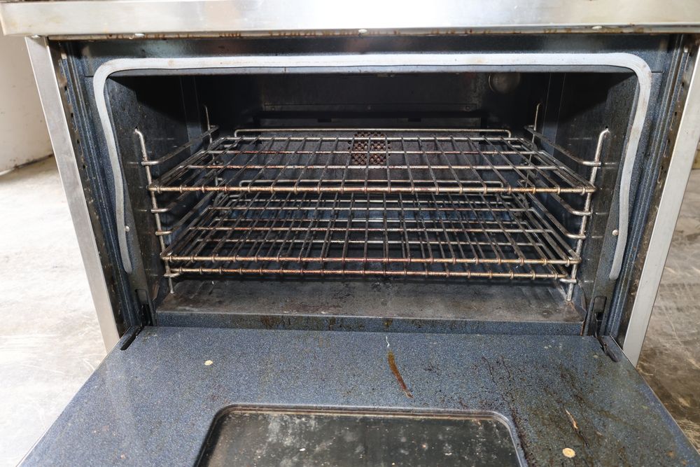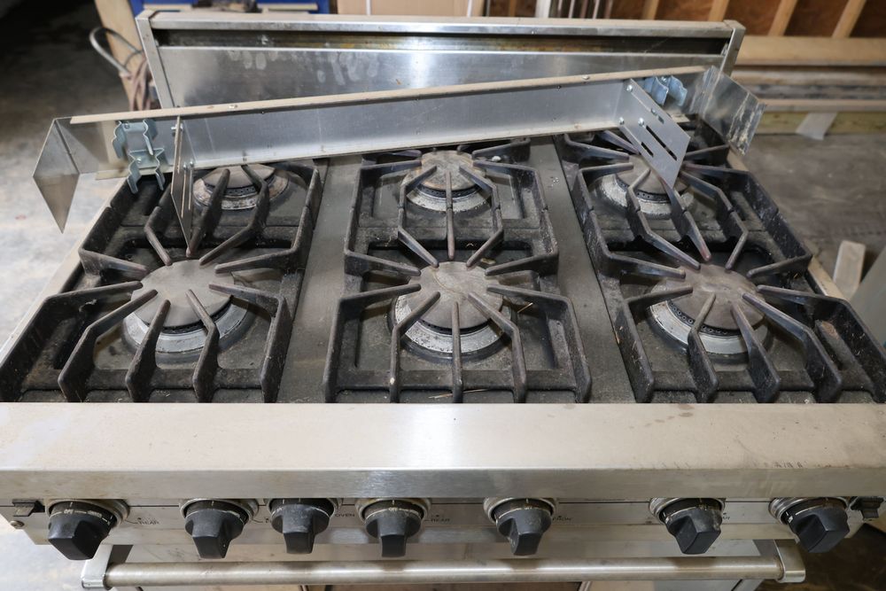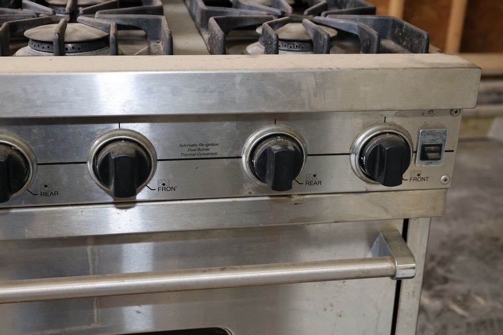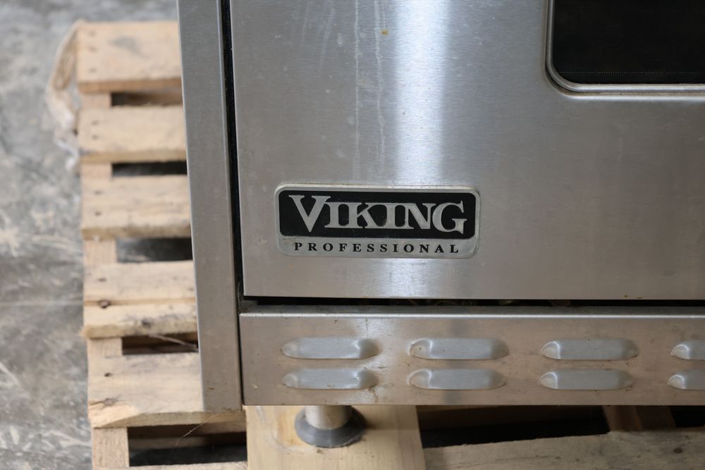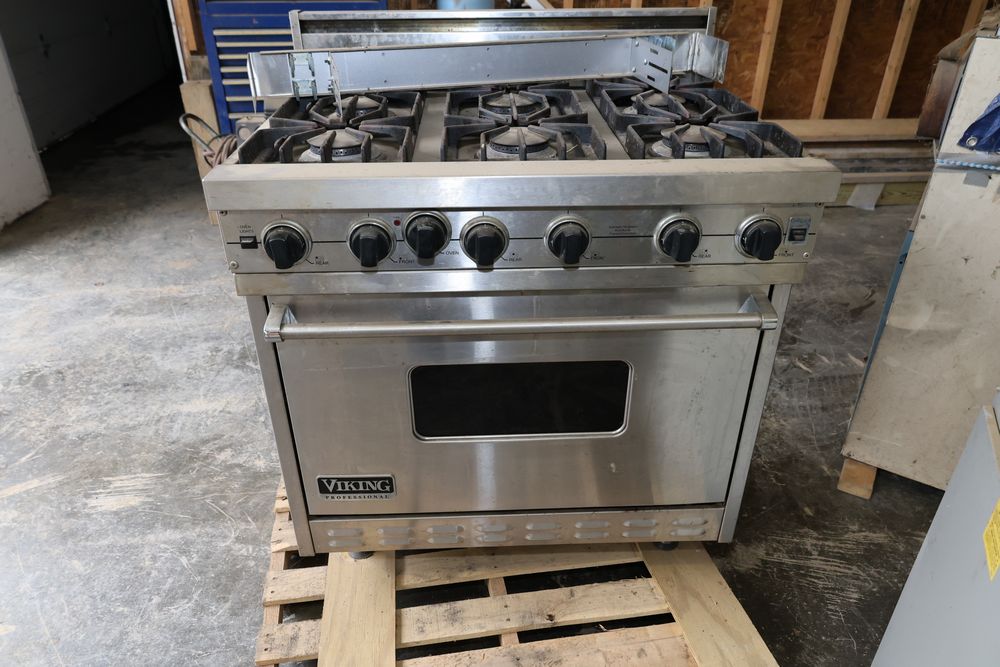 Viking Professional 6-Burner Stainless Steel Gas Range with Oven six cast-iron burners with individual control knobs and automatic re-ignition system. The integrated oven includes two internal racks and is labeled as thermal-convection. Exterior finish is stainless steel with front-facing control panel and viewing window on the oven door. Seller reports: was operational when removed.