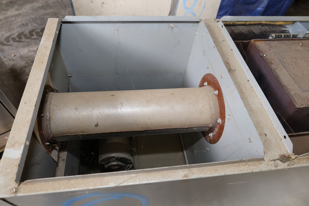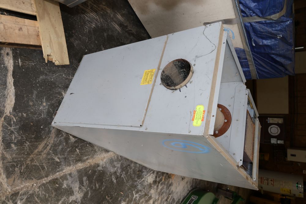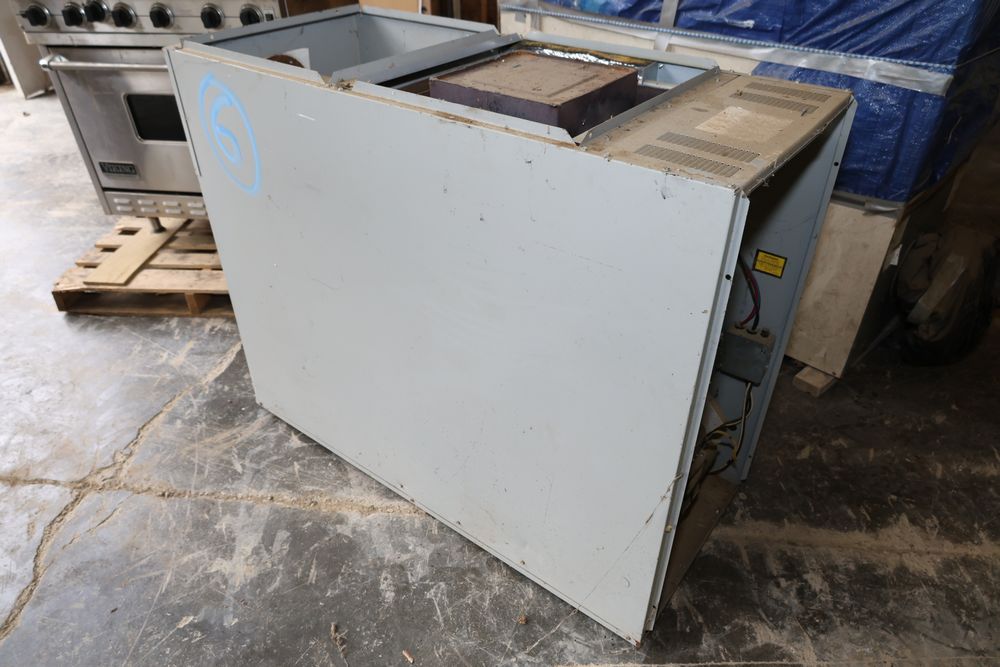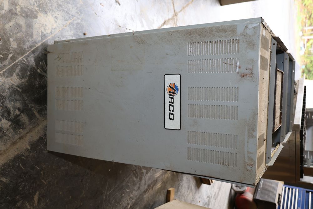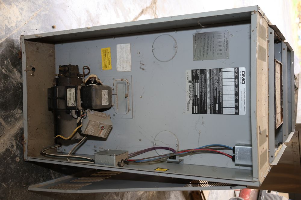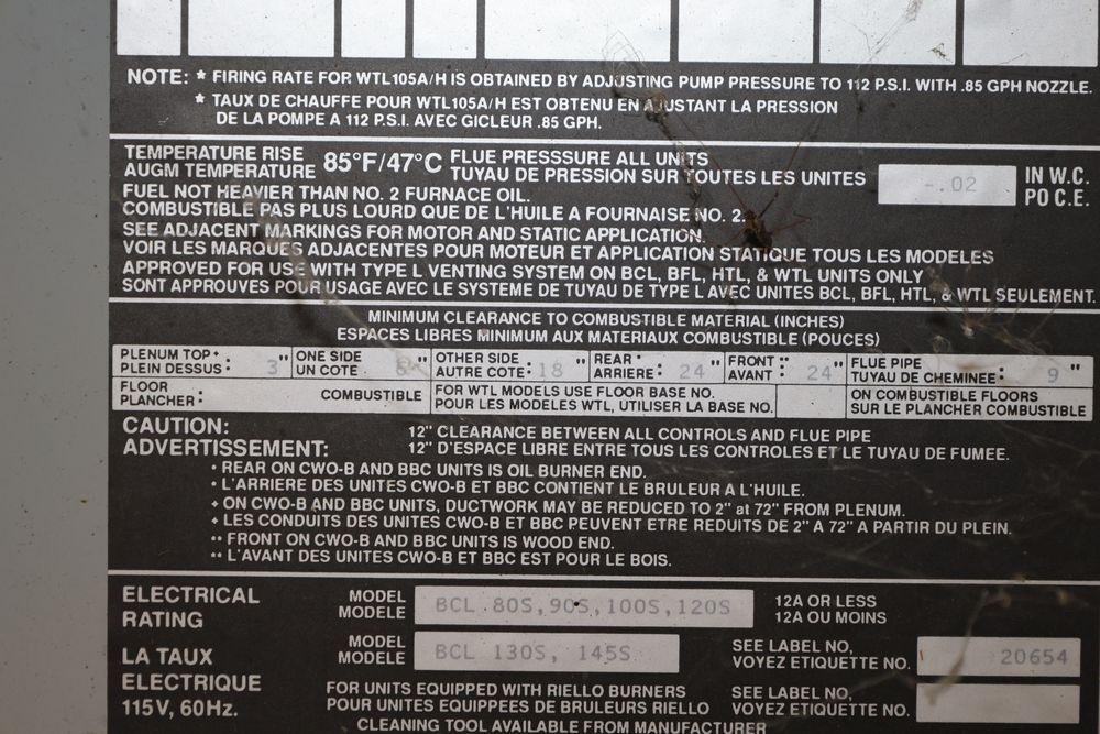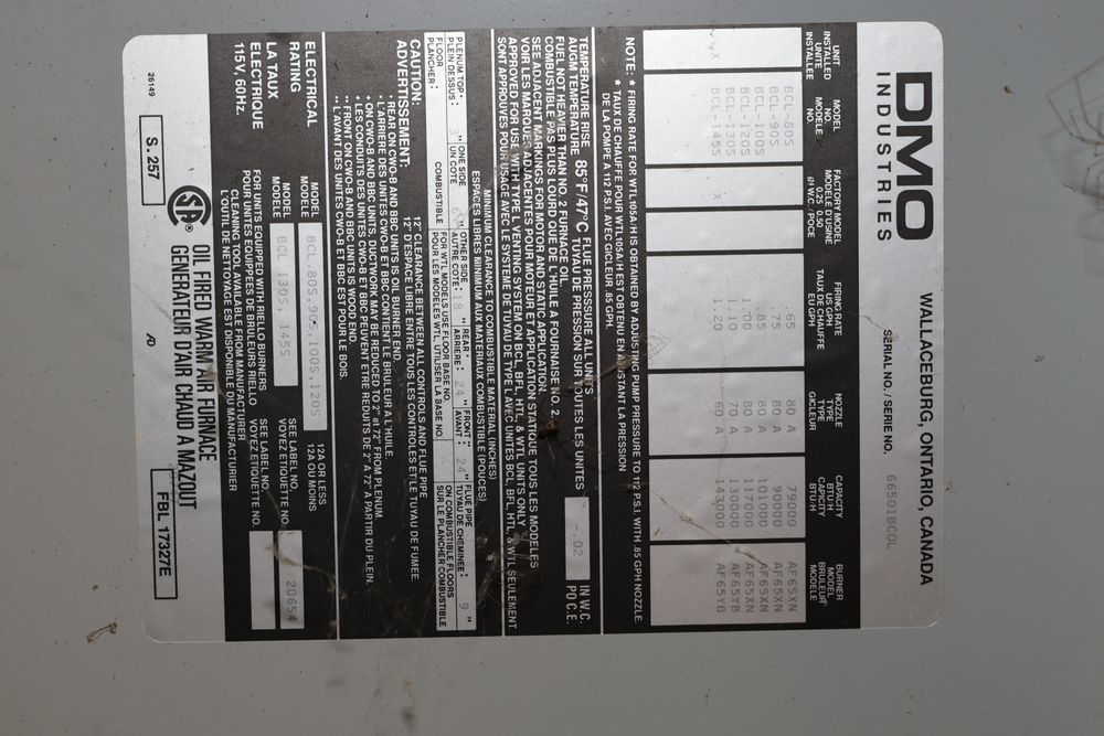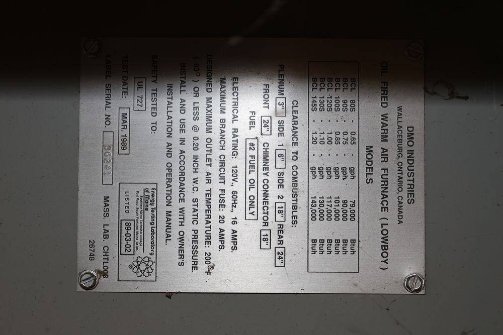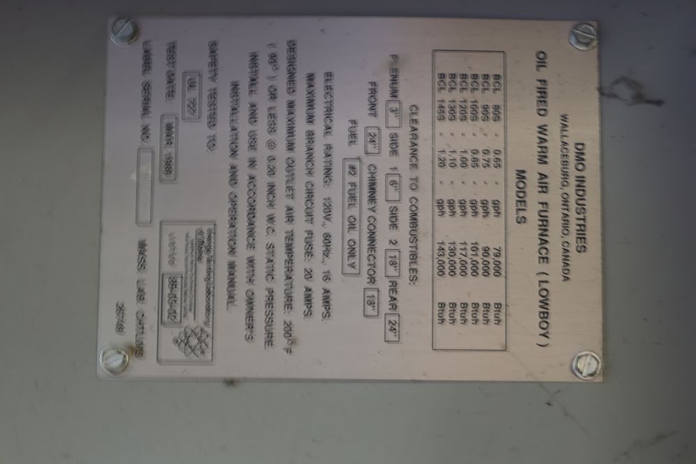 DMO Industries oil fired warm air furnace. Unit includes specifications and information on firing rates, electrical ratings, and safety details as shown on the labels. This furnace is designed to operate on fuel oil with a maximum outlet air temperature of 200F. Seller reports: was operational when removed.