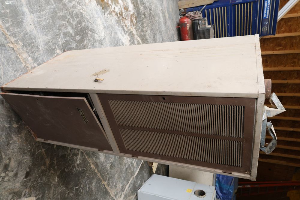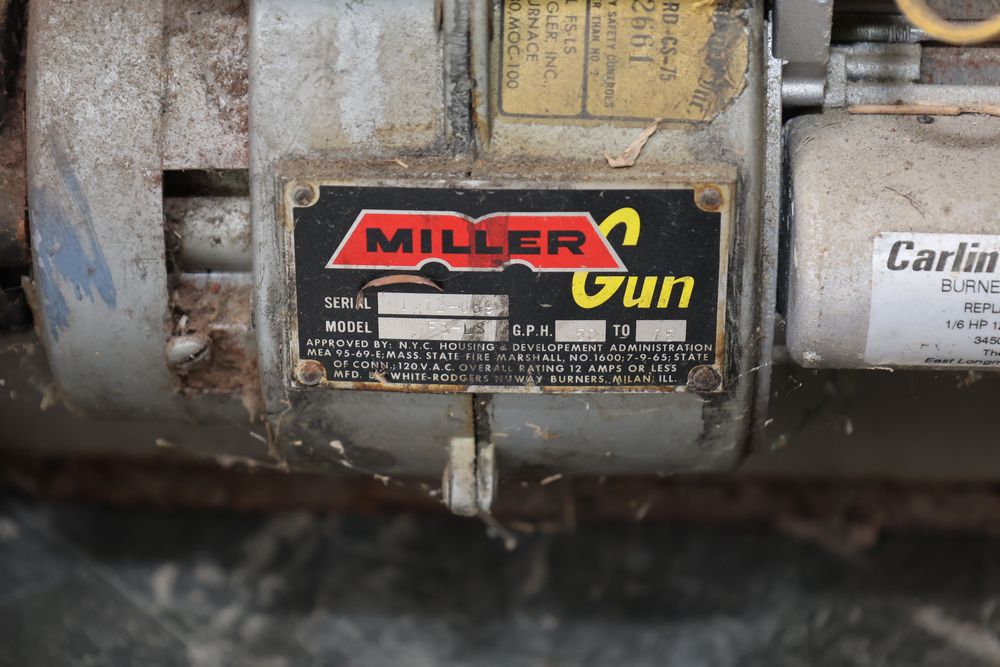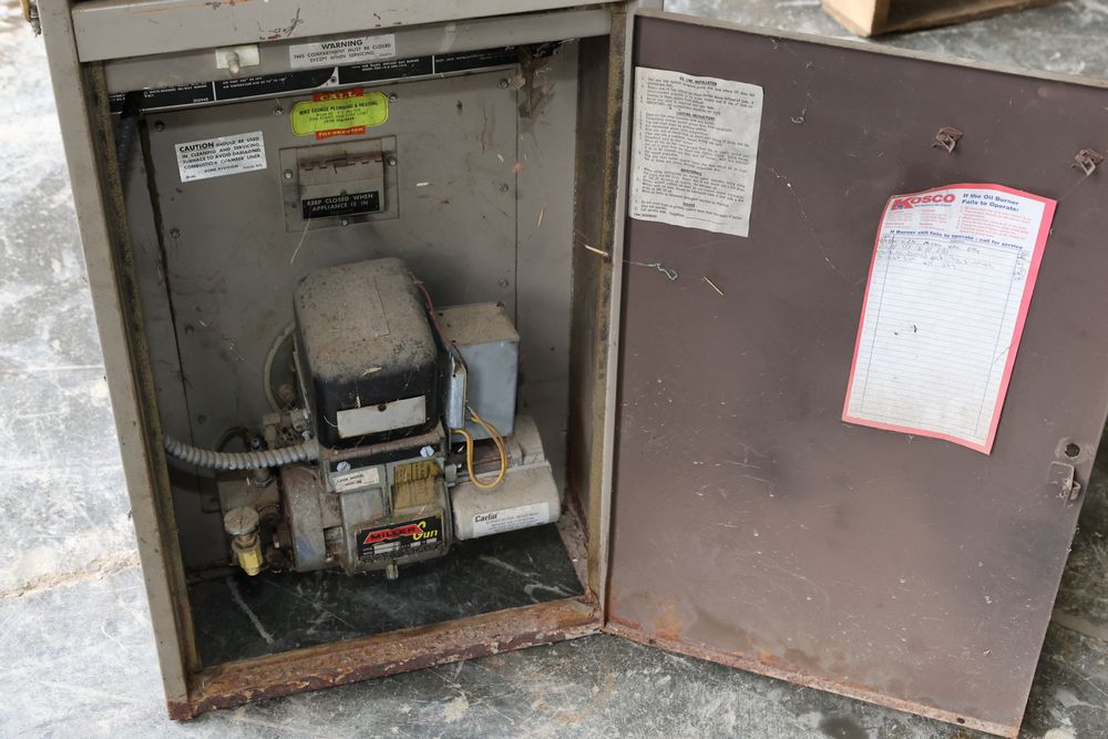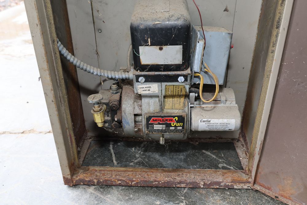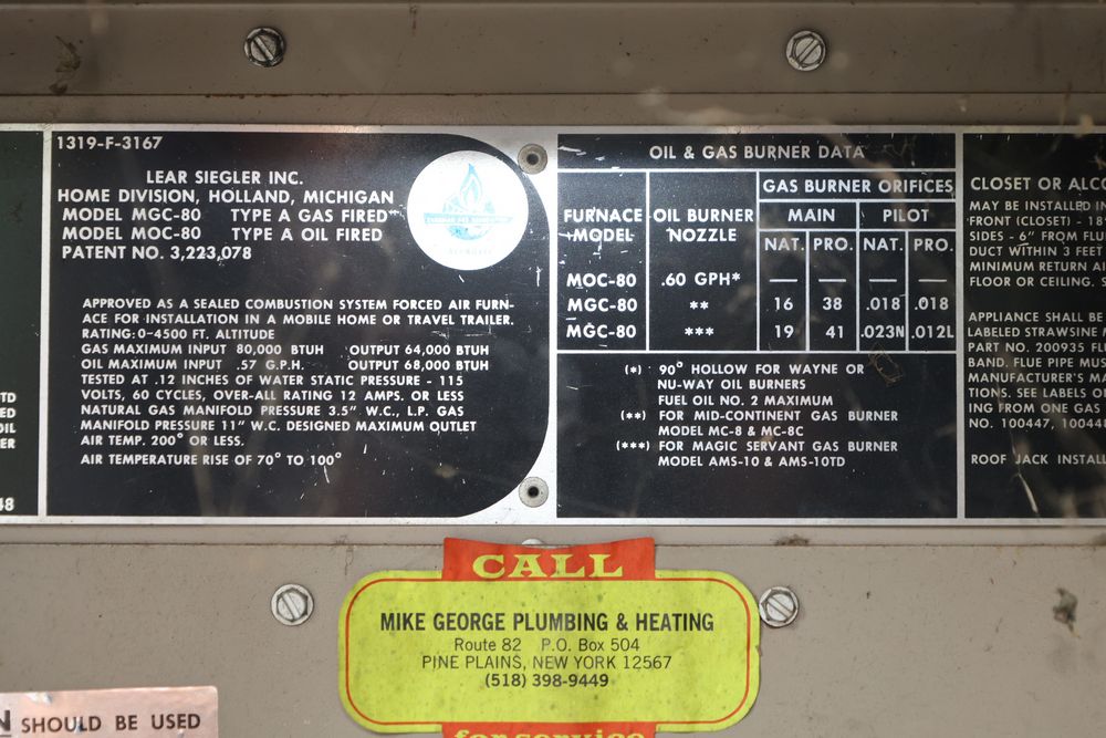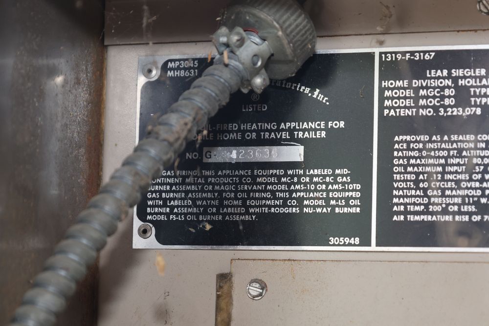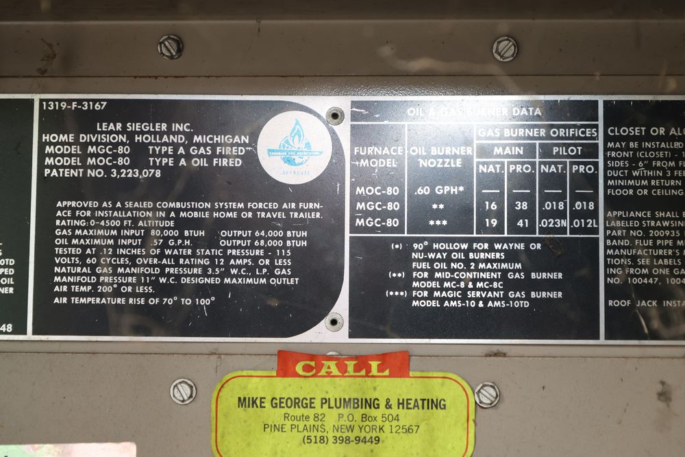 Lear Siegler Inc. MGC-80 heating appliance for home or travel trailer. This furnace includes an oil burner and nozzle. The model indicates a maximum input capacity of 80,000 BTU per hour. Seller reports: was operational when removed.