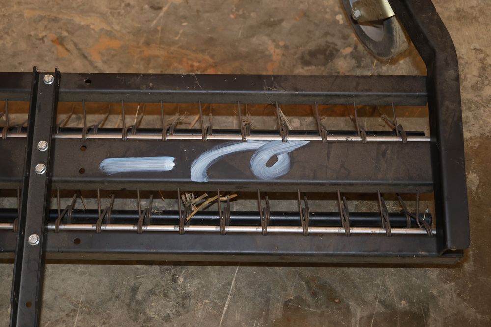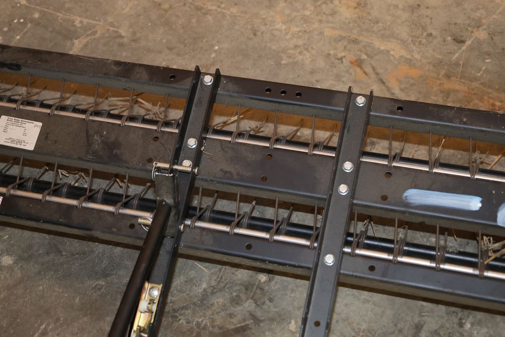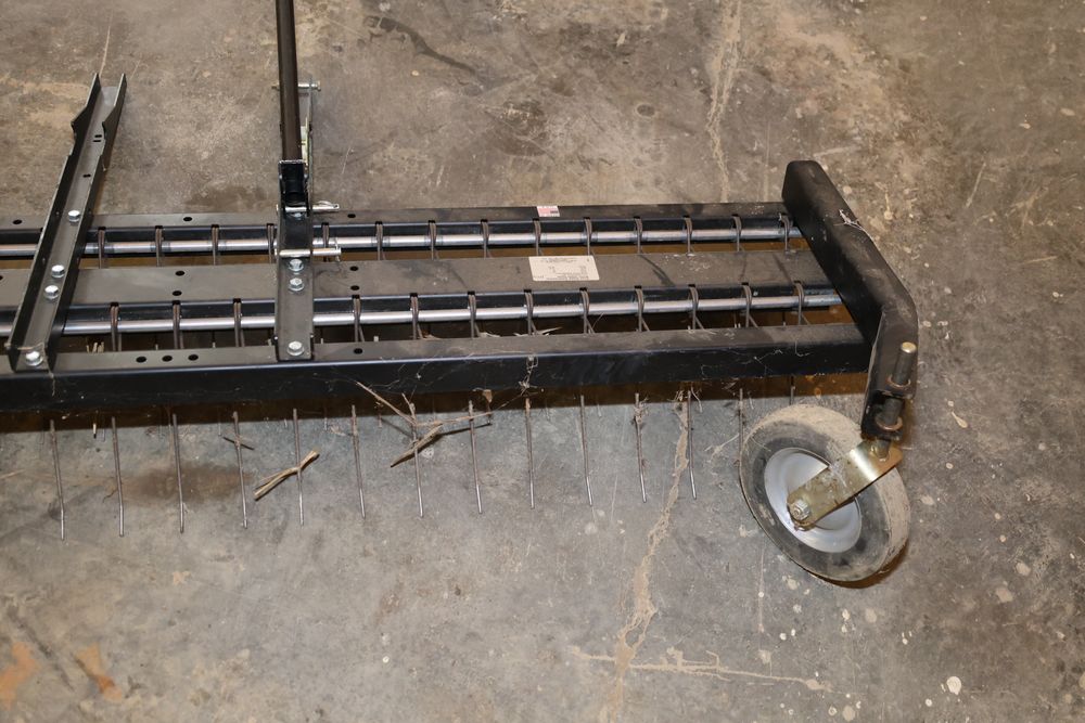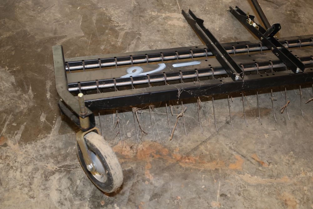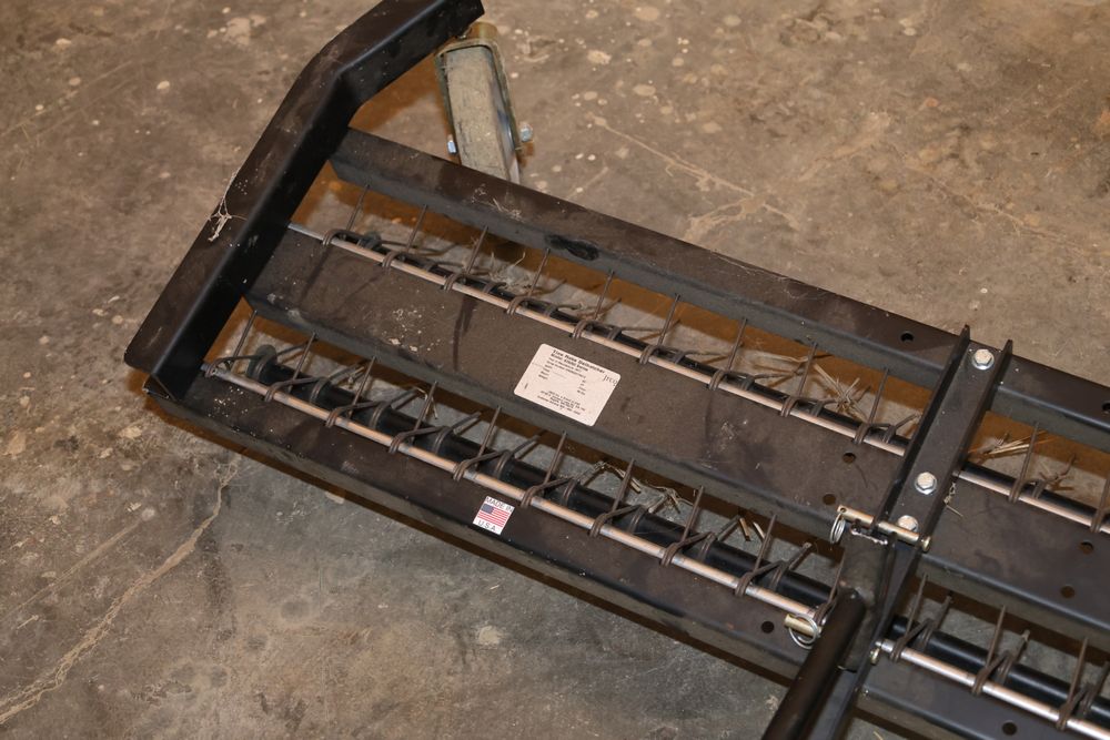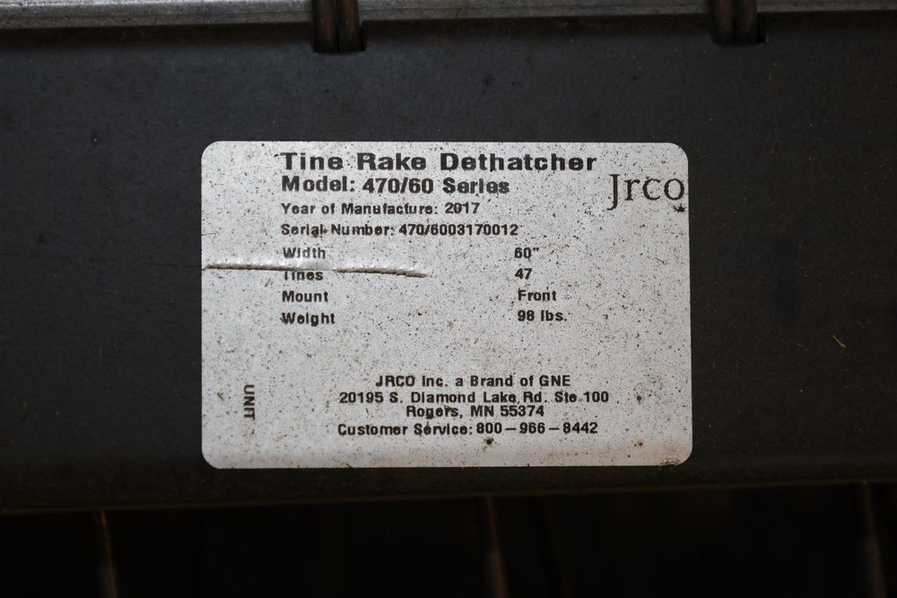 JRCO Tine Rake Dethatcher Model 470/60 Series, manufactured in 2017. Features a 60-inch width and includes 47 tines. Unit weight is 98 lbs and is designed for front mounting.