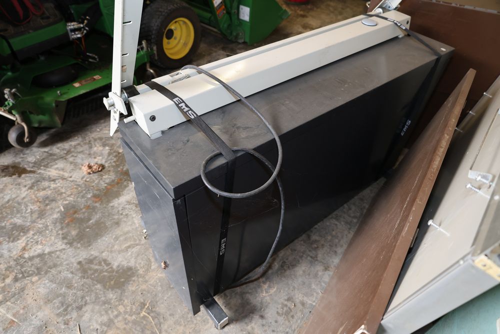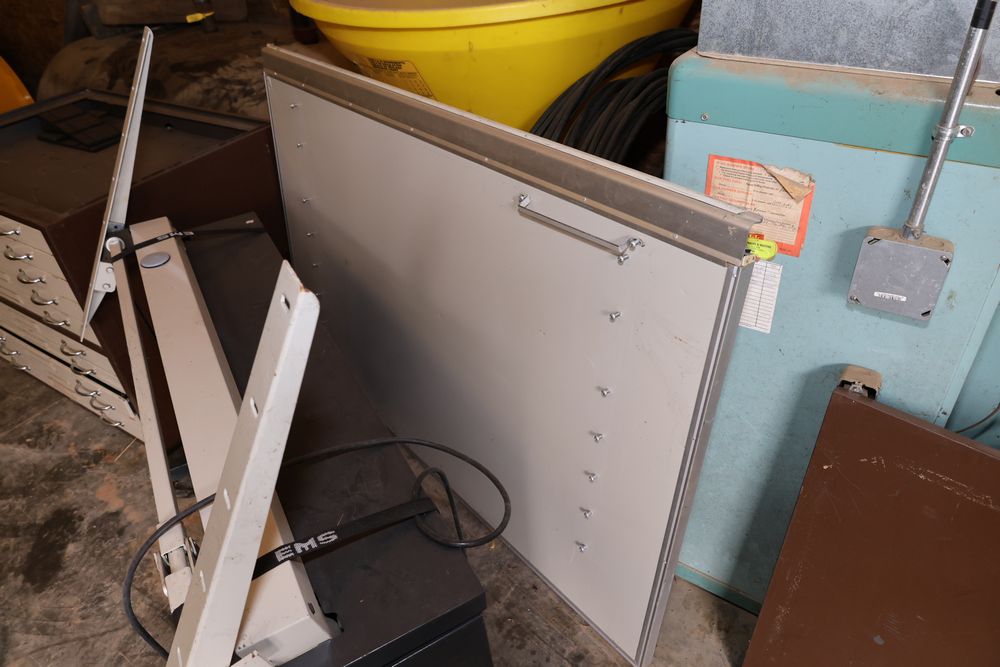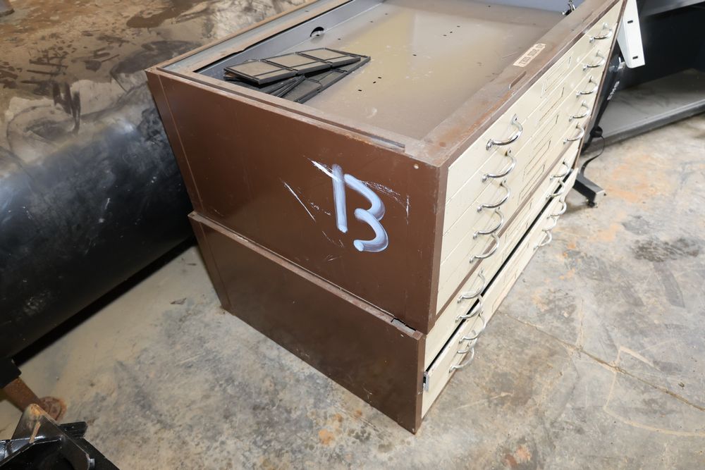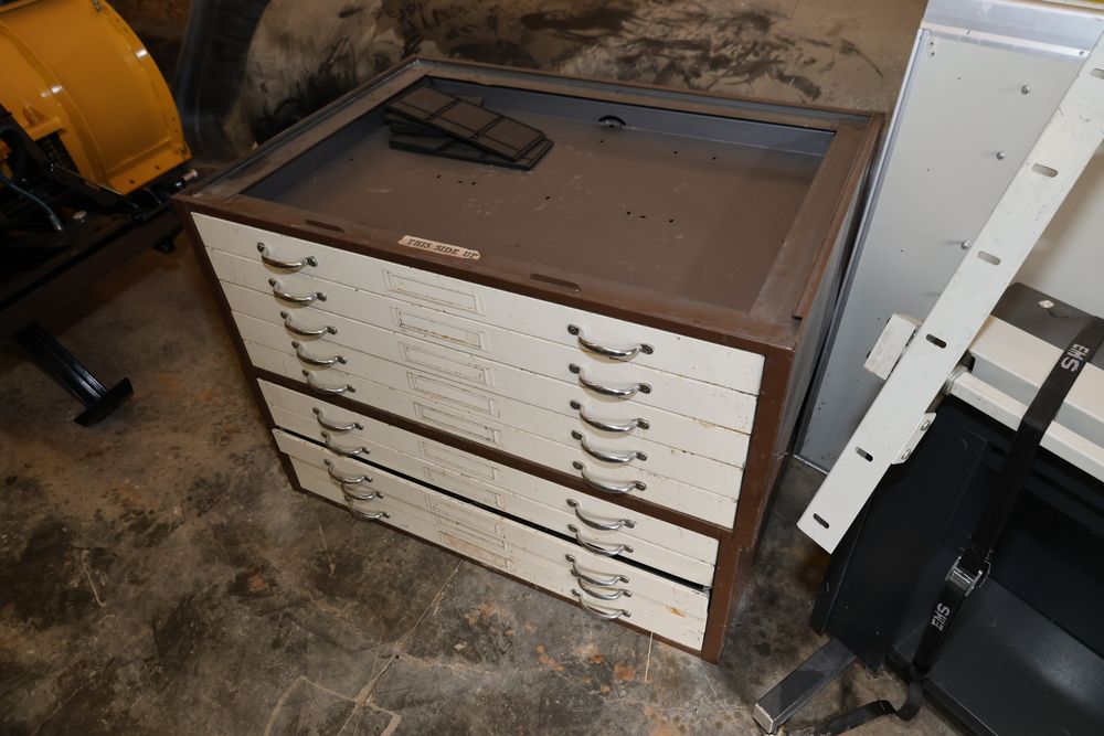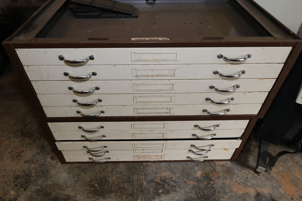 Metal blueprint flat file cabinets with multiple drawers accompanied by a flat drafting table and a wheeled stand. The cabinets feature handles and offer significant storage capacity ideal for large-format documents or artwork.