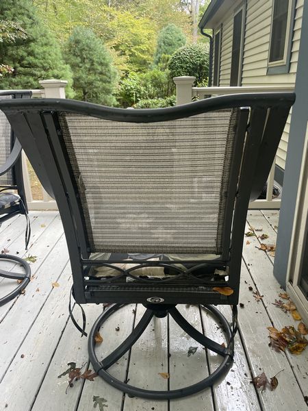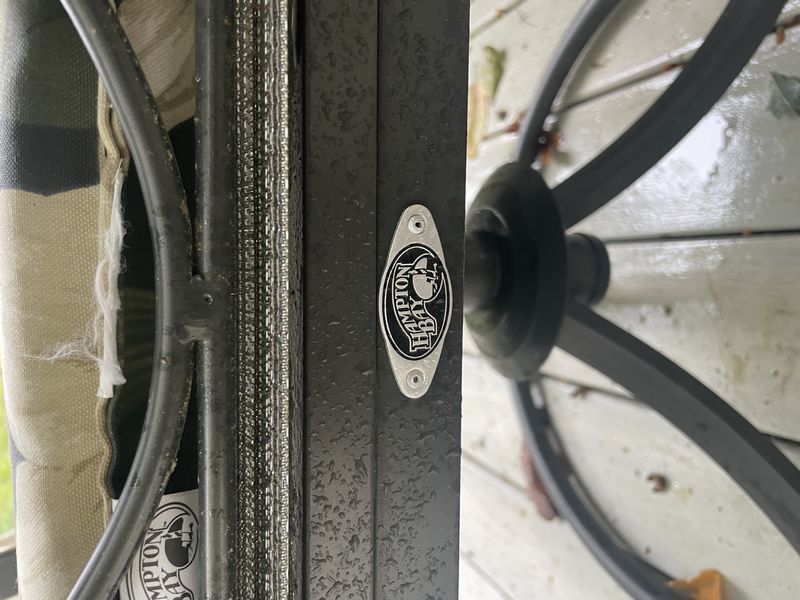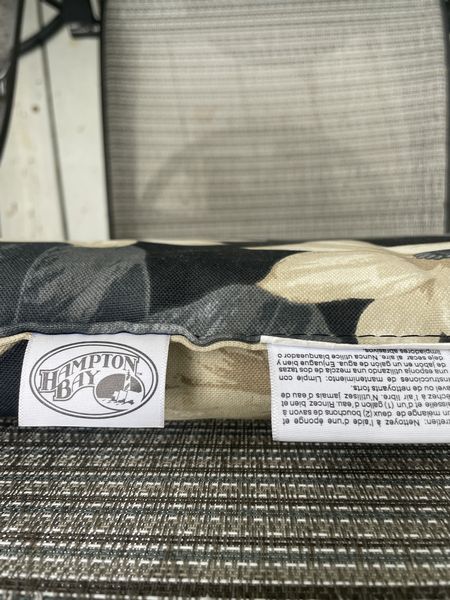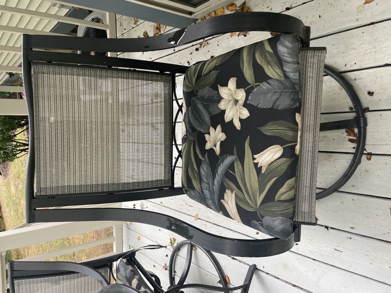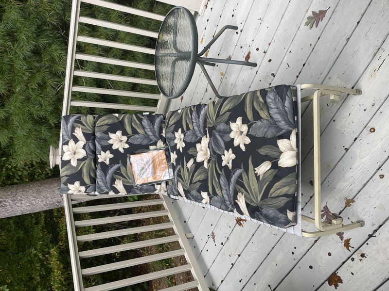 Hampton Bay Outdoor Seating. Hampton Bay outdoor dining set incl: table, 4'dia; set of 4 swivel armchairs, ea. 18"Wx20"Dx3'H with chair floral pads; chaise lounger, 68"Lx13"H; round side table; green umbrella with stand; protective covers-see photos for details.