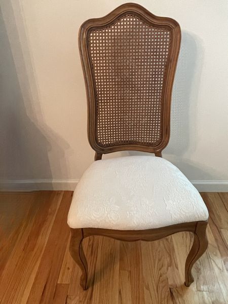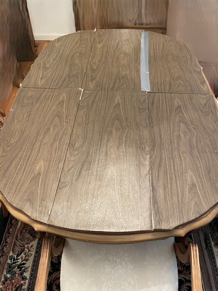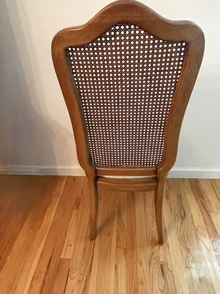 Thomasville Dining Set, Area Rug. Thomasville oval dining table with three 1' table inserts & custom pad, 58"Lx41"Wx30"H; set of six cane back chairs with padded seats (two arm chairs, ea. 21"Wx17"Dx43"H & four side chairs, ea. 18"Wx17"Dx 43"H); area rug approx. 9'x6'. Table & chairs match hutch in Lot #18.