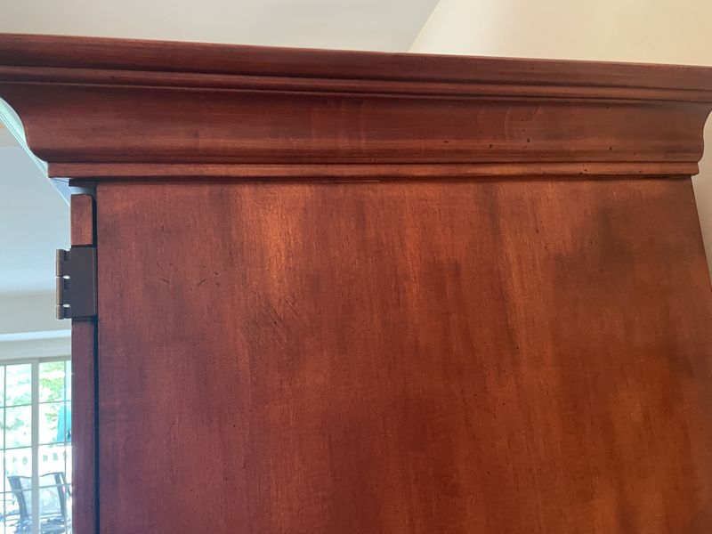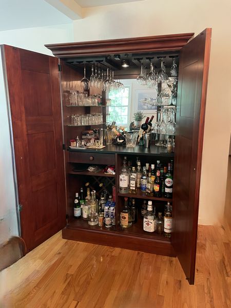 Cherry Bar Armoire. Romweber US made bar lighted cabinet with crown molding & paneled doors, mirrored back, six glass shelves, single inside drawer & wine rack, 43"Wx25"Dx74"H. Contents not incl, see lot #17.