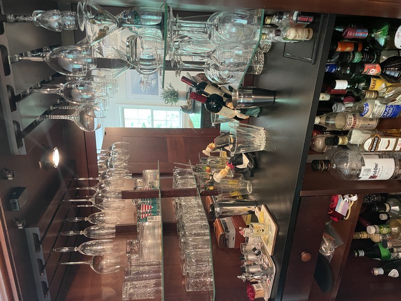 Items include Thomasville glass dining set & front hutch; Shoji screens; modern upholstered Queen Ann winged-back recliner; Corning/Pyrex cook/bake ware; Hampton Bay outdoor dining set; Royal Horticultural Society "Hookers Fruit" fine bone China cups; traditional sideboard; Shaw US made area rug; Romweber US made bar lighted cabinet; wicker chair; Cavalier cedar chest; office furniture & more. Items are located in Niantic, CT.