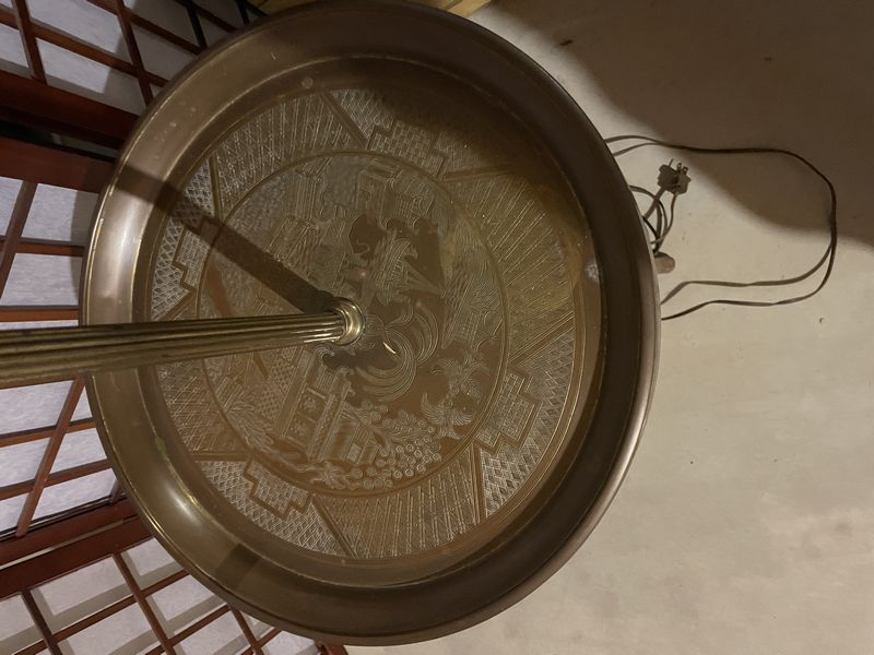 Cedar Chest, Shoji Screens, Tables. Cavalier cedar chest with felt tray & key, 44"Wx17"Dx21"H; brass lamp table, approx. 45"H; pr shoji screens, ea. 70"H; small side table. Located in the basement.