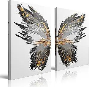 2 PCS Framed Black And Gold Butterfly Wings Canvas Wall Art Modern Aesthetic Vogue Decor Poster For Living Room Bathroom Home Office Artwork Gift Ready To Hang (16"x24"x2PCS)
