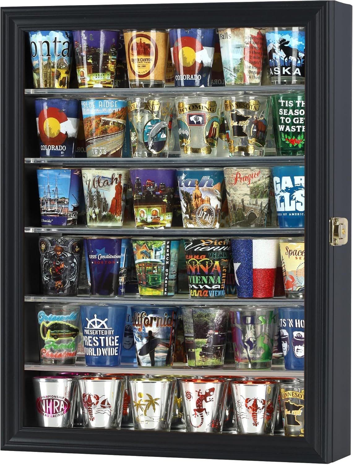 Small Curio Cabinet Display Case with Shelves Compatible with Lego Mini Figures, Shot Glasses, hot Wheels, Small Rocks, Mirror Background in Black Finish Frame. Pickup Only.