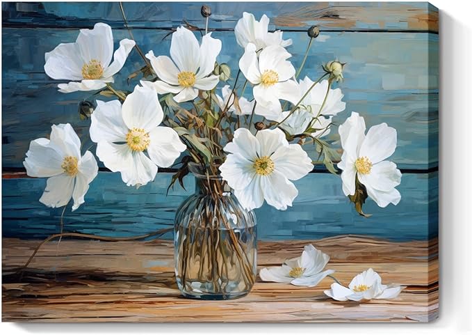 Mid-Century White Floral Blue Art Painting Vintage Flower Blossom in Vase Canvas Wall Art for Bathroom Bedroom Living Room Kitchen Office Decor 16x12inches