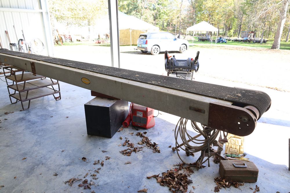 Items include Kubota L3710 HST tractor with Kubota LA682 front end loader, Case 585 tractor, 1988 Eager Beaver 9 ton tag-a-long tri-axle trailer, 15' English travel trailer,Ford post hole diggers, Ford model 909 5' rotary cutter industrial brush hog, Ford 6' back blade, 7' power angle snow plow set up for Bobcat quick change, Hytrol model R reversable folding conveyor 21' long, and more. Items are located in Staatsburg, NY.