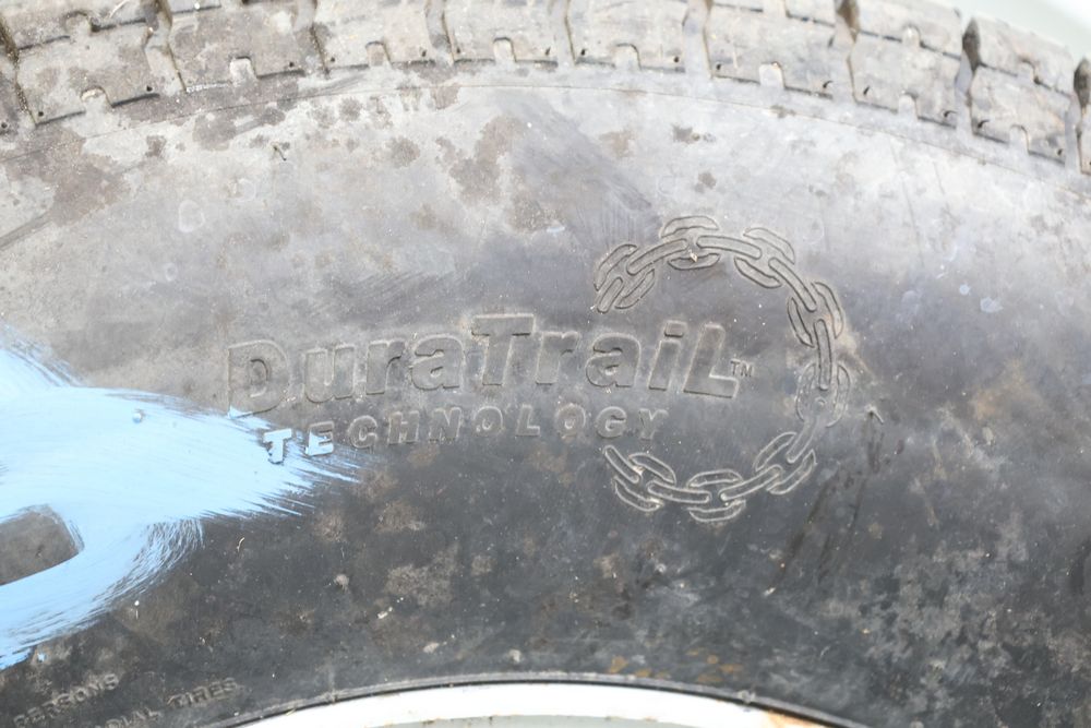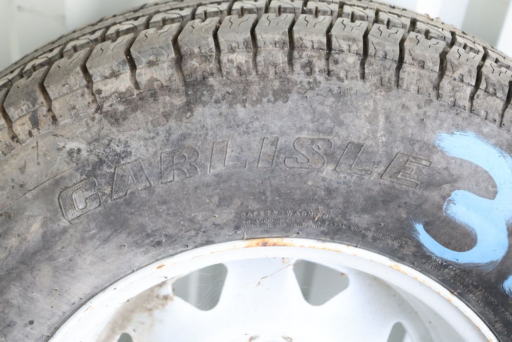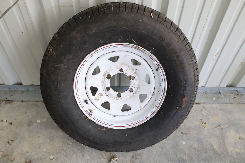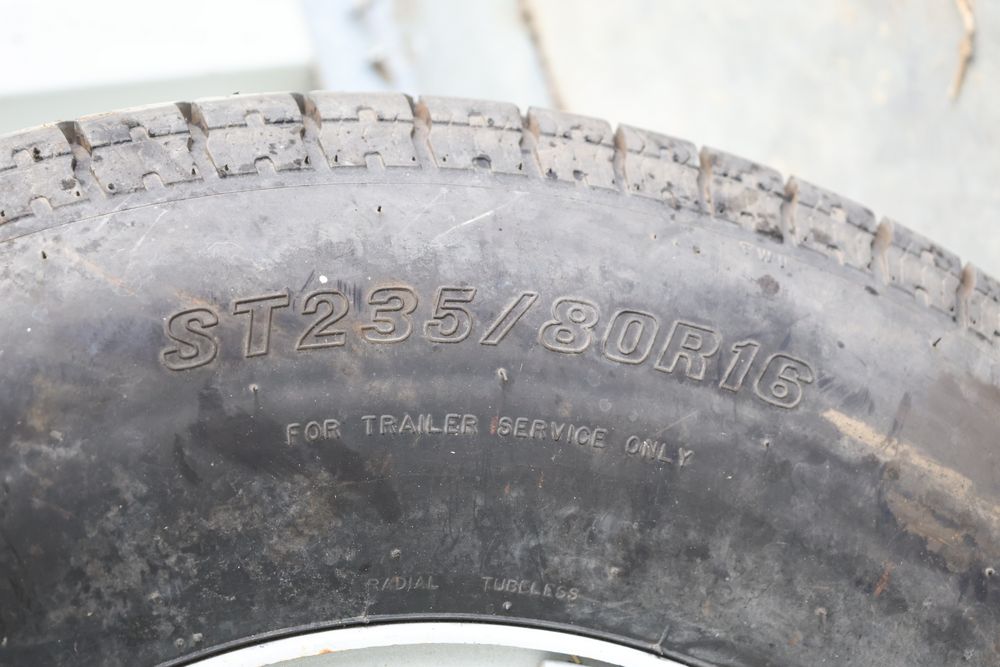 Carlisle trailer tire on rim ST235/80R16 load range E six lug 5.5ctr with 4.25 center hole.