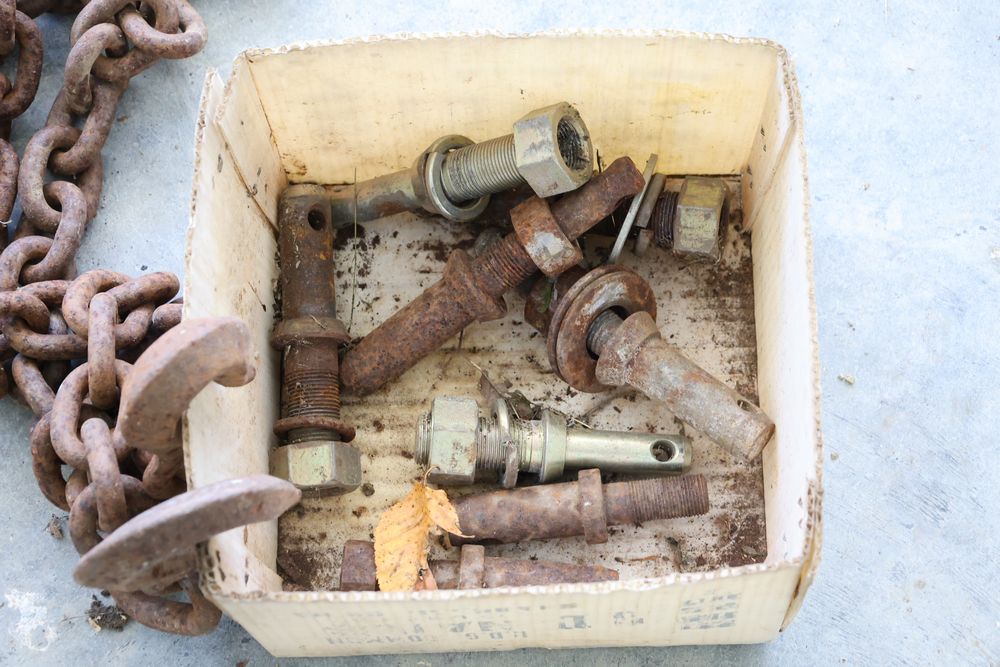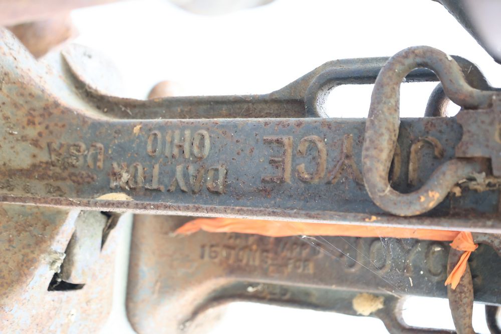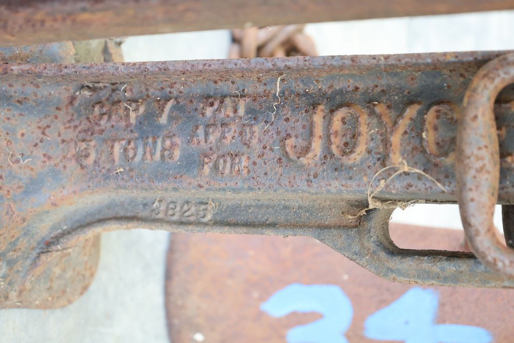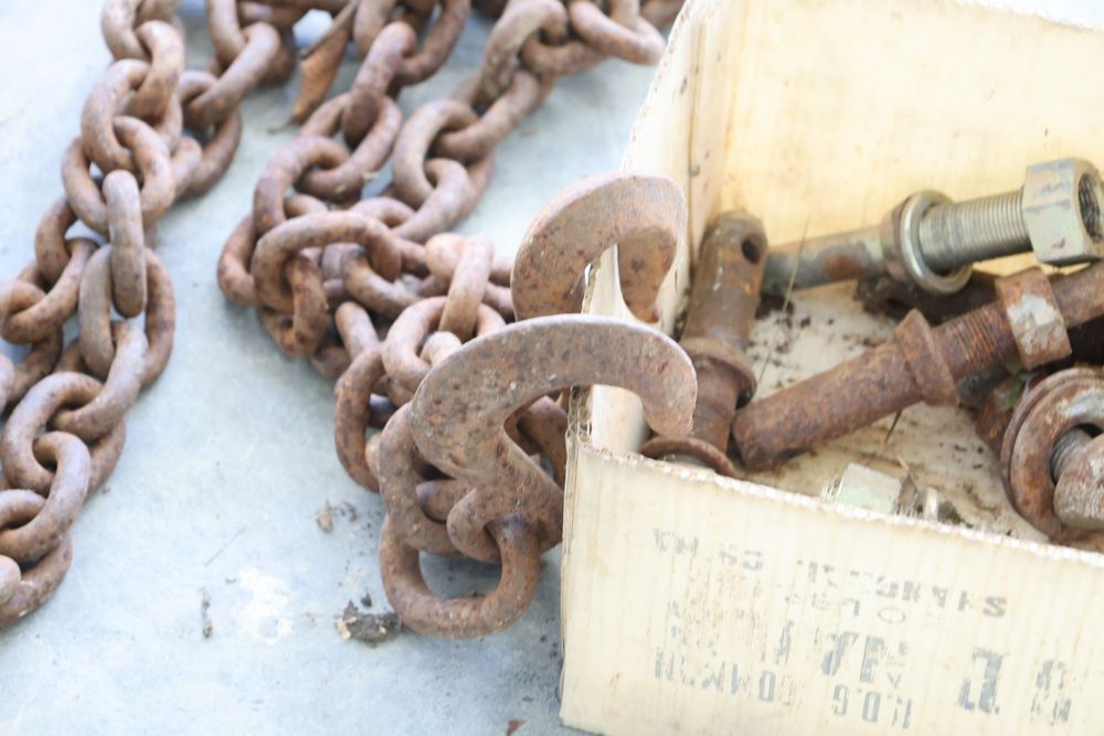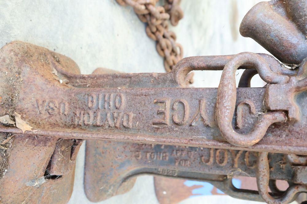 Three jacks including two 15 ton Joyce jacks number 1928A, heavy duty 1/2" chain, and assorted tractor hardware.