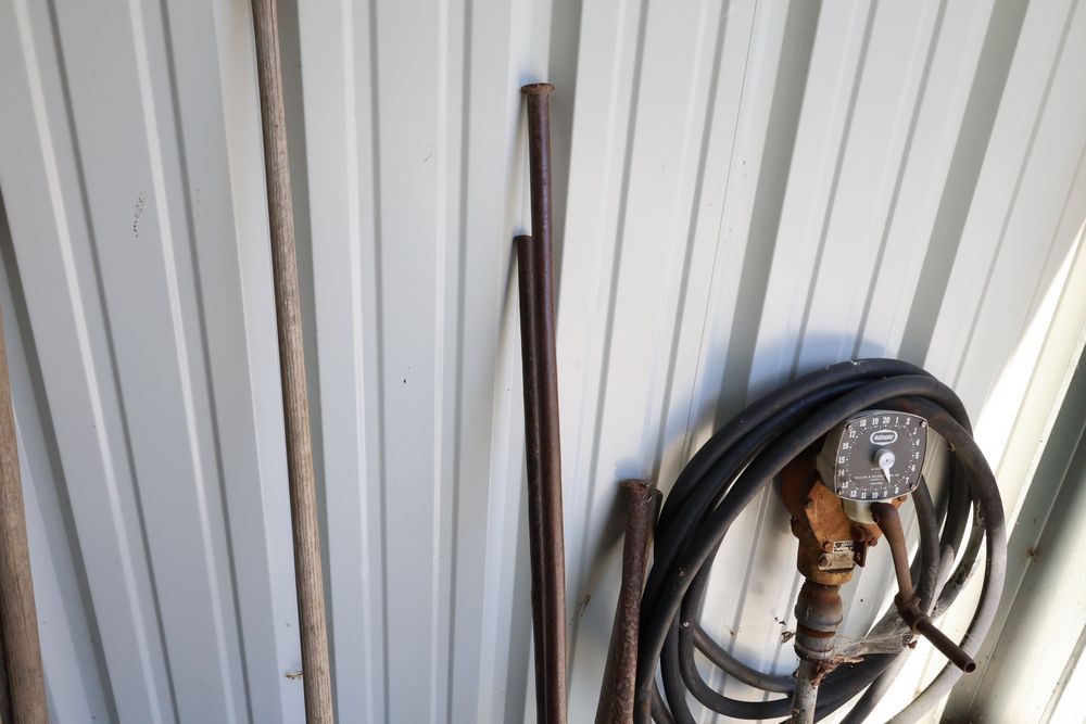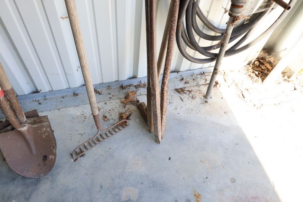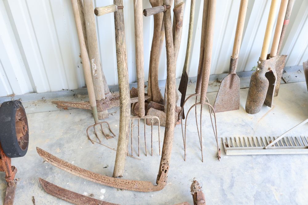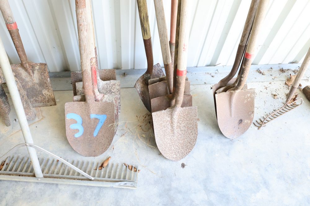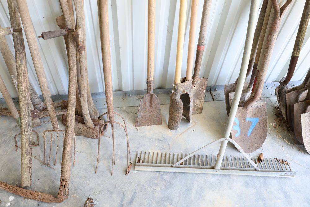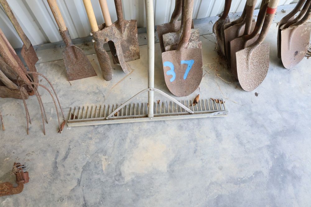 Hand tools including aluminum finish landscaping rake, Gasboy model 1230C rotary hand pump, rakes, shovels, etc.