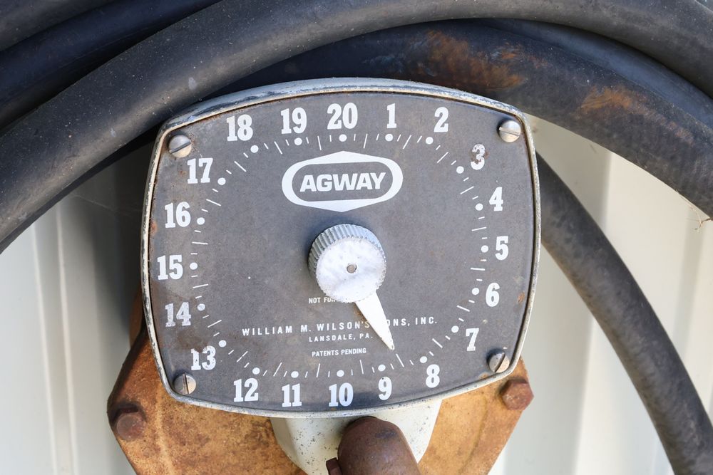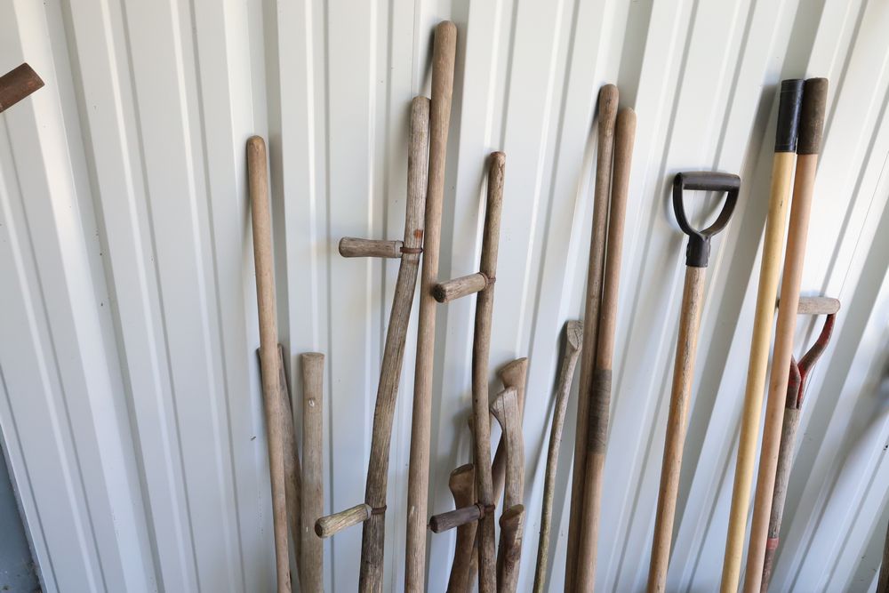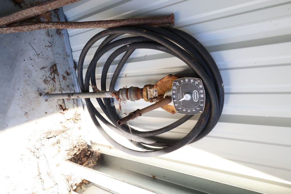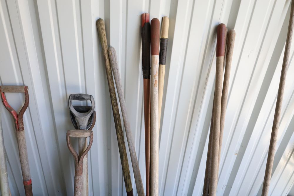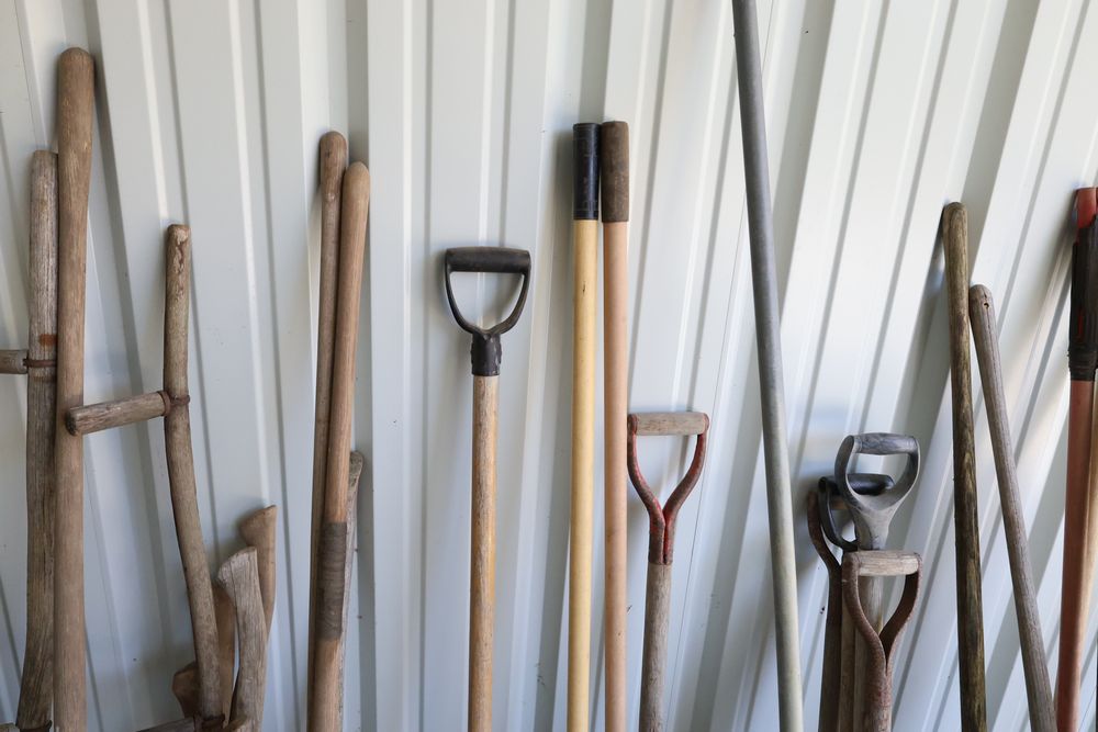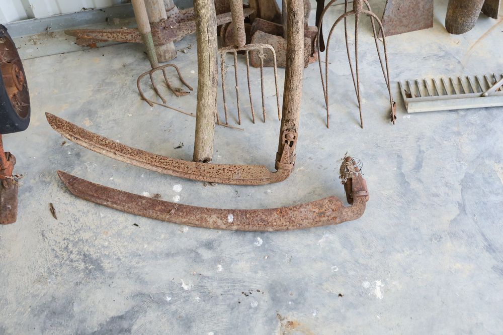 Hand tools including aluminum finish landscaping rake, Gasboy model 1230C rotary hand pump, rakes, shovels, etc.
