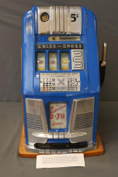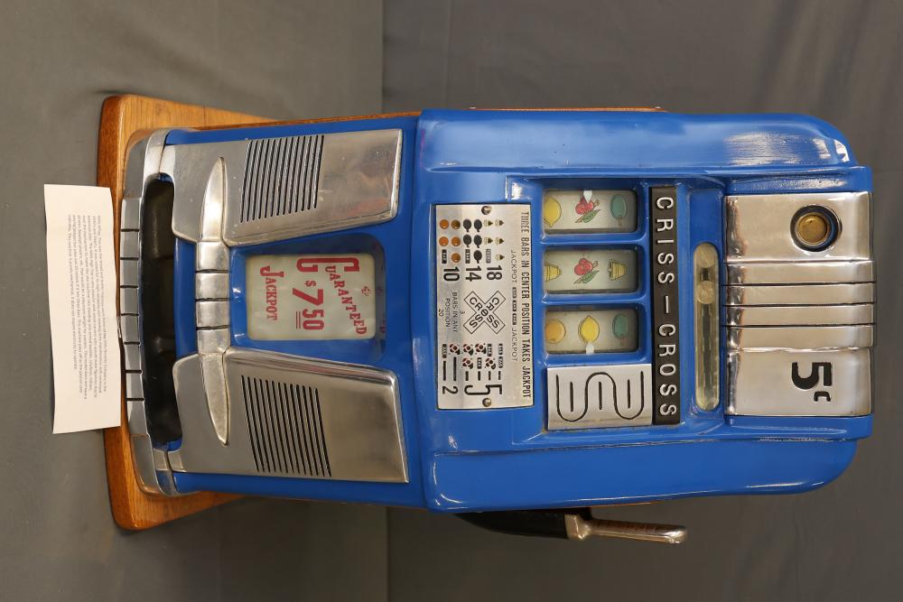 Criss-Cross 5-Cent Mechanical Slot Machine with Wooden Base. Featuring a classic design with a blue and chrome exterior, this slot machine operates entirely mechanically without requiring electricity. Includes detailed payout instructions on the front panel and features wooden side panels. The interior displays intricate gears and mechanics for operation. Comes with two keys for back panel access. Pickup only.