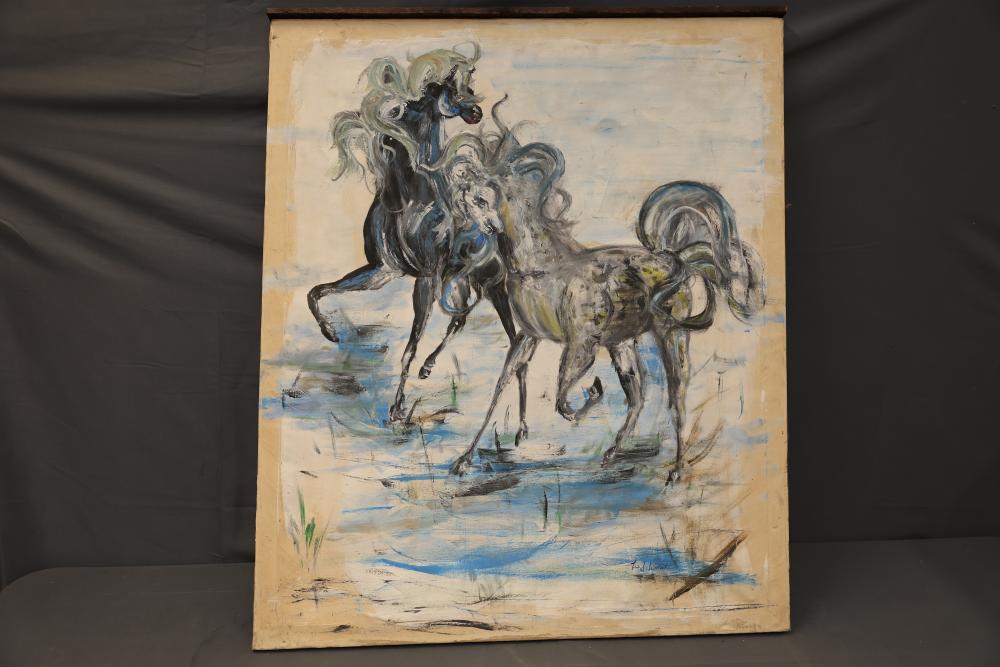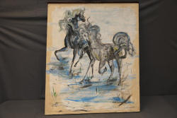 Lee Schmitt Painting Depicting Two Horses in Motion. Artwork executed in a stylized manner with dynamic lines and a muted palette of blues, black, and earthy tones. Signed 'Lee Schmitt' in the lower portion of the painting. Mounted on a stretched canvas. Pickup only.