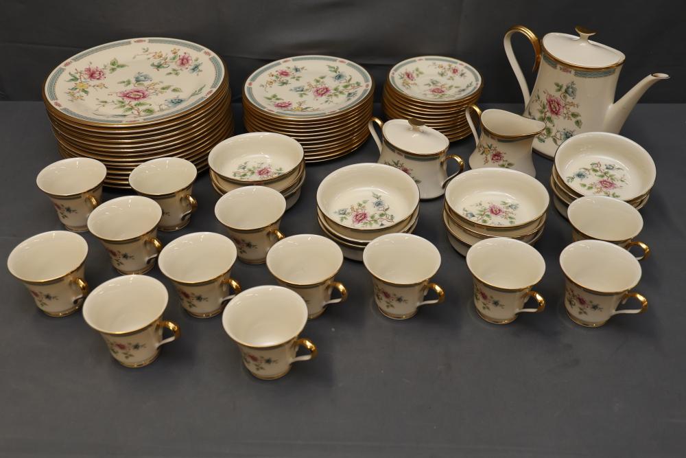 Lenox Morning Blossom Porcelain Dinnerware Set with Gold Accents. Includes plates, cups, saucers, a teapot, sugar bowl, creamer, and bowls. Features floral designs with gold accents. Pickup only.