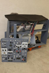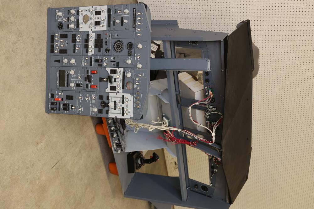 Flight Simulator Cockpit with Control Panels, Seat, and Pedals. Includes a detailed control panel system with labeled switches and knobs, a reclining gray leather seat with adjustable armrests, foot pedals, and visible internal wiring. Features branding from Thrustmaster and Element Electronics. Electronics and components untested. Pickup only.