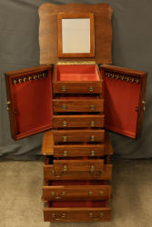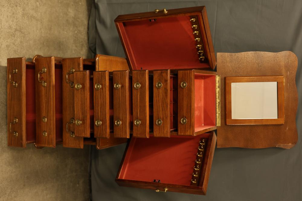 Wooden Jewelry Armoire with Brass Hardware and Multiple Velvet-Lined Drawers. Features a hinged top with a mirror, side doors with necklace hooks, and multiple drawers lined with red velvet, offering a combination of segmented and open storage. Jewelry case: 33"x19"x15.5" and table is 29"x24"x13". Pickup only.