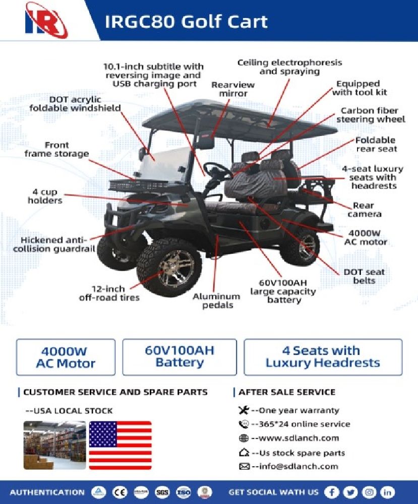 New 2025 Grey Electric Four Person Golf Cart Model IRGC80 with 4KW AC Motor. Features include a rear camera, LED display, foldable rear seats, a canopy cover, and a DOT foldable acrylic front windshield. Equipped with DOT seatbelts, carbon fiber steering wheel, and 12-inch off-road tires. The cart has a top speed of 23-24mph and includes a 60V100AH battery. Item is disassembled but appears complete. Pickup only.