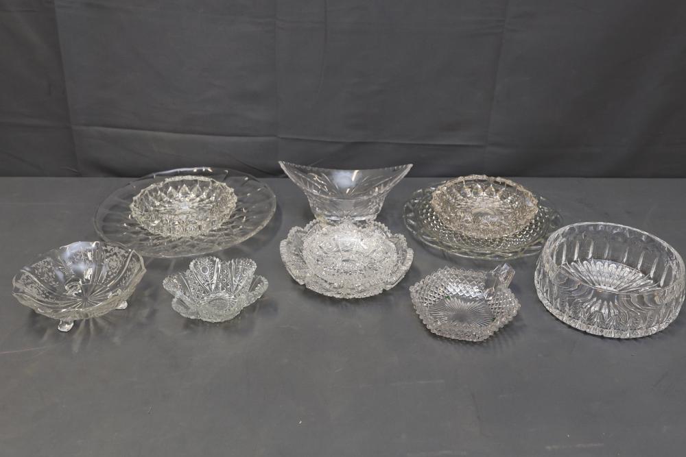 Clear Pressed and Cut Glass Bowls and Dishes. Group includes pressed and cut glass bowls and dishes with various decorative patterns, such as geometric and floral designs. Some are footed, and the group features a mix of round and scalloped edges. Pieces appear in good condition with typical wear. Pickup only.