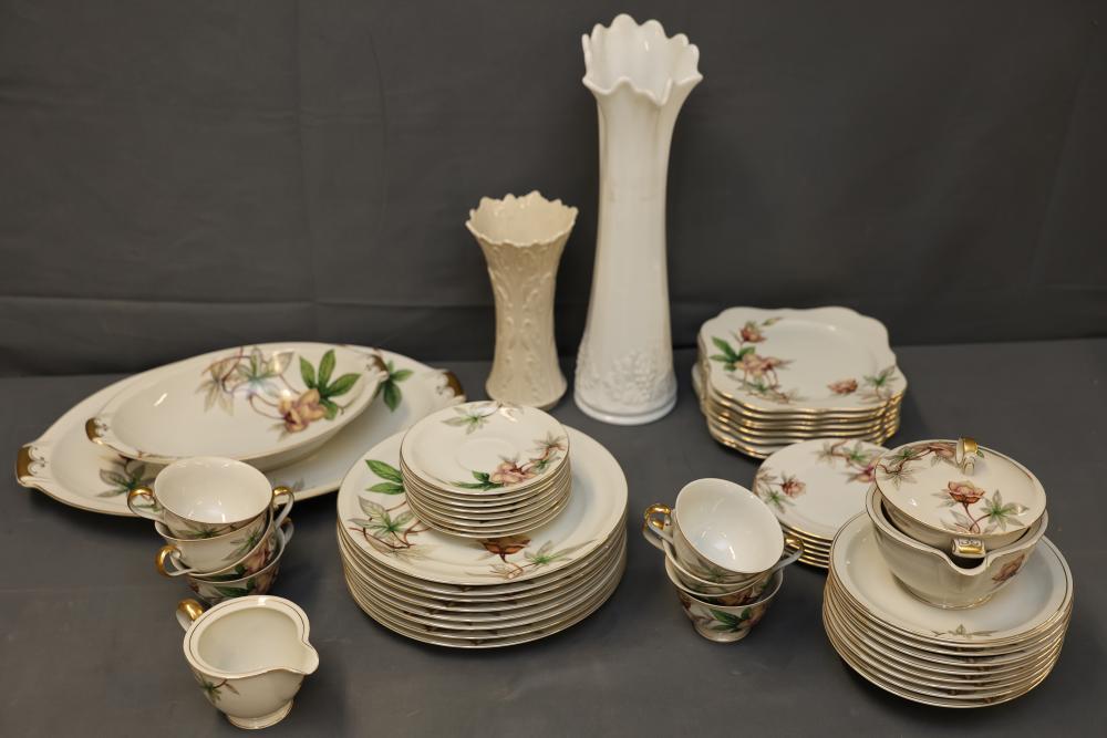 Ivory China dinnerware set with floral design and gold trim, marked 'Woodrose,' including plates, cups, saucers, a lidded bowl, a cream pitcher, and serving platters. Two white vases with textured floral details complement the set. Pickup only.