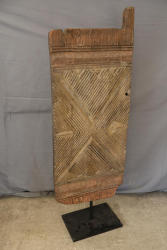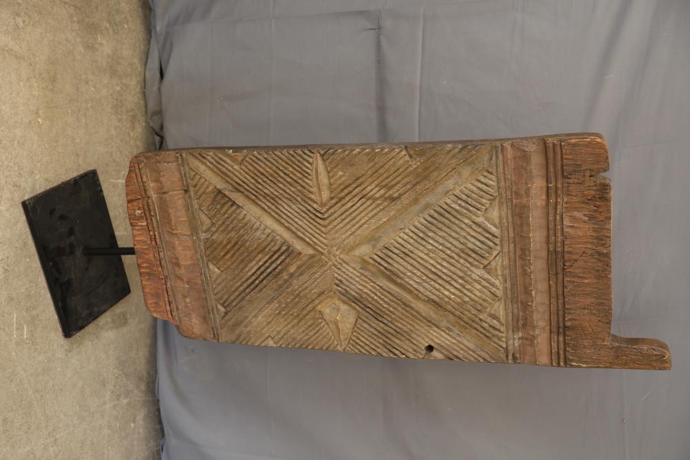 Hand-Carved Wooden Panel With Geometric and Textured Design on Display Stand. Features intricate carvings on one side with a geometric pattern and textured detailing, while the reverse side shows a textured carved pattern. Mounted on a black metal display stand for presentation. 46"x18". Pickup only.