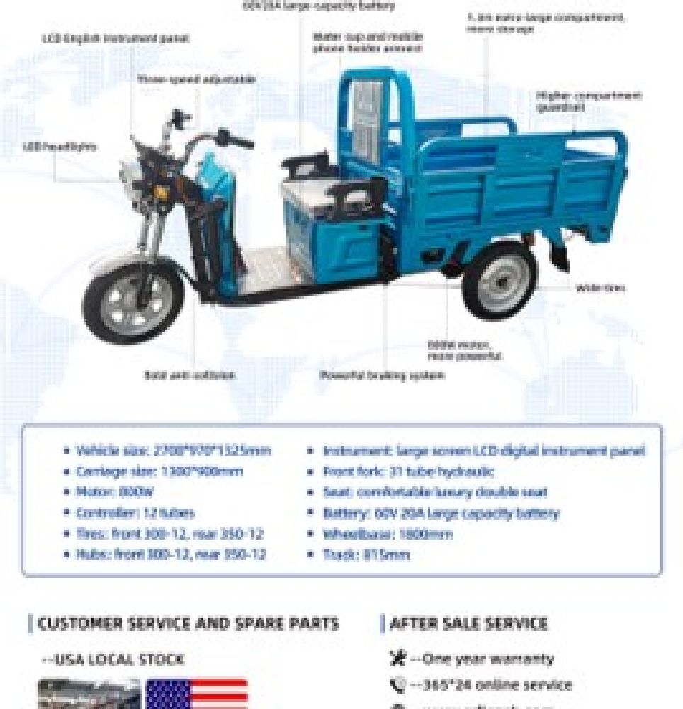 New 2025 Blue Electric Tricycle Model IRET13 with Dump Bed. Features an LCD instrument panel, LED headlight, rechargeable battery, three adjustable speeds, and an 800W motor. Comes with a movable guardrail dump bed, 60V 20Ah large-capacity battery, and hydraulic front fork. Disassembled and appears complete. Pickup only.