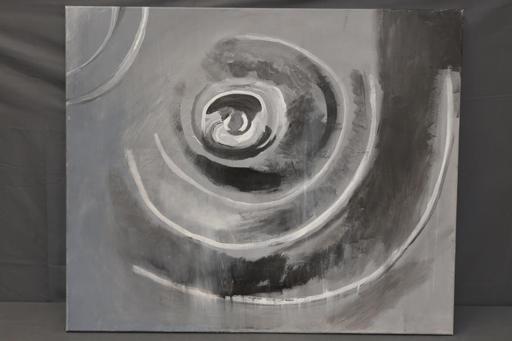 Faridah Nsubuga 2015 'Confusion' Acrylic on Canvas Painting. Abstract composition featuring concentric swirling forms in shades of black, white, and gray. Signed and dated on the back of the canvas. Canvas is stretched over a wooden frame. Minor wear visible on edges. Pickup only.