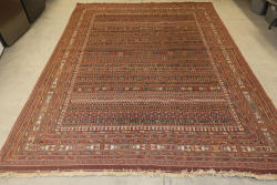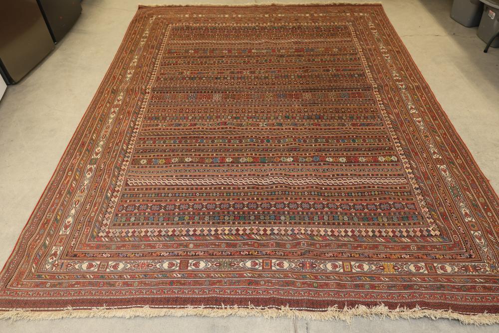 Hand-knotted wool rug with intricate geometric and floral patterns in a multicolored palette. Features a central area filled with dense linear motifs and a wide border showcasing repeating detailed designs. Fringed edges on two sides exhibit minor wear. Overall colors include shades of red, brown, blue, and cream. 10'x13'. Pickup only.