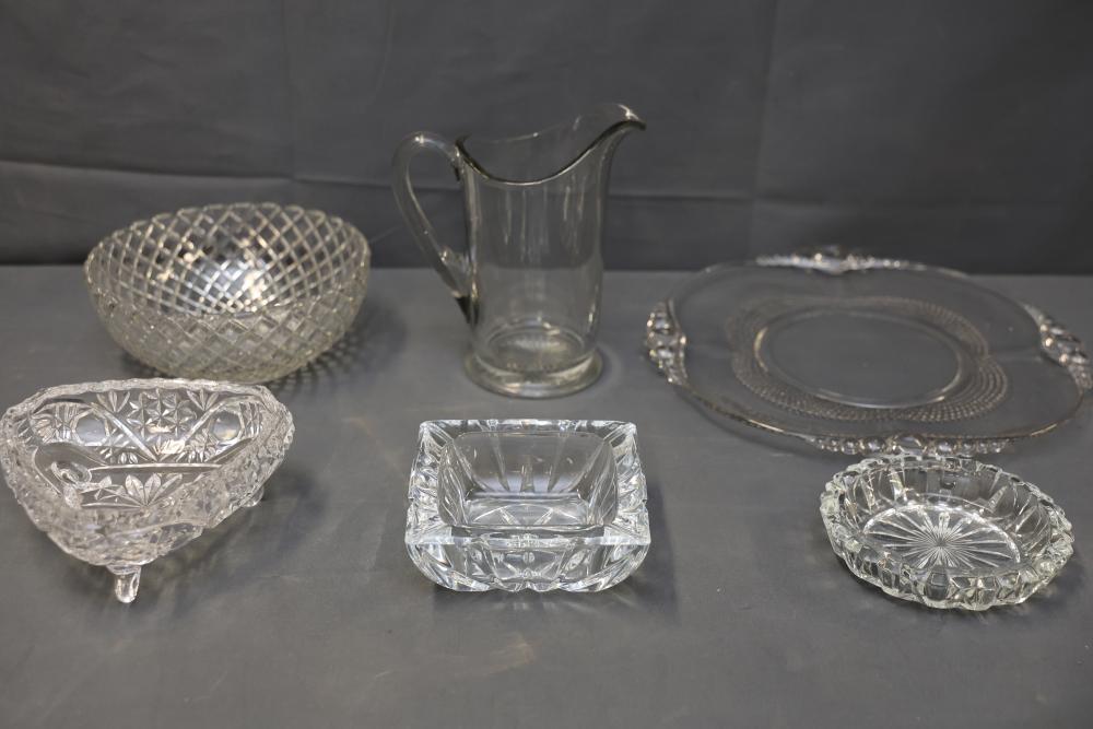 Six Cut Glass and Pressed Glass Tableware Pieces, including a pitcher, a large bowl with diamond-cut pattern, a pressed glass plate with decorative edging, a heart-shaped bowl, a square dish with starburst design, and a small round dish. Tableware pieces exhibit intricate patterns typical of cut and pressed glass. Pickup only.