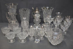 Waterford Crystal Shakers and Assorted Crystal Glassware. Includes a pair of Waterford crystal salt and pepper shakers and a variety of cut-crystal items such as vases, a decanter, stemware, decorative pieces, and more. Pieces feature intricate designs and a polished finish. Pickup only.