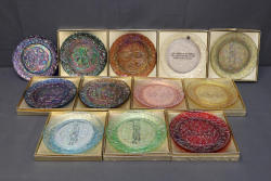 12 Imperial Glass 'Twelve Days of Christmas' collector plates made of iridescent glass. Each plate is intricately embossed with designs representing lyrics from the traditional Christmas carol, such as 'Eleven Ladies Dancing' and 'Seven Swans A-Swimming.' Includes original labels and packaging, as shown. Pickup only.