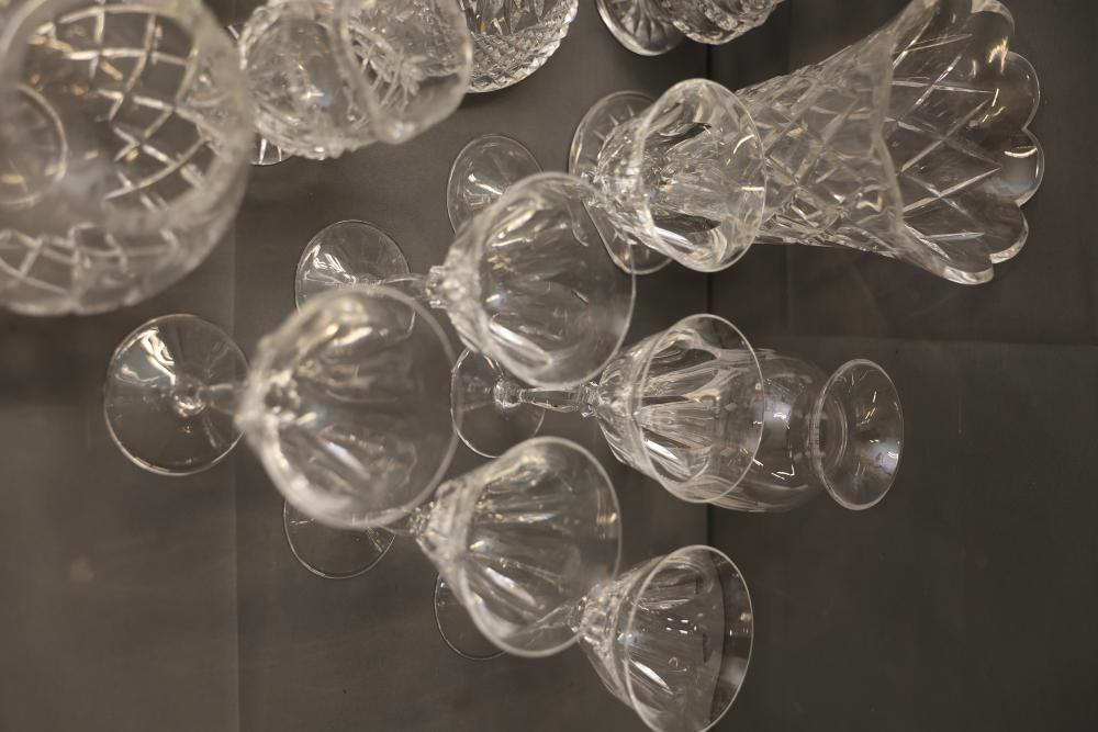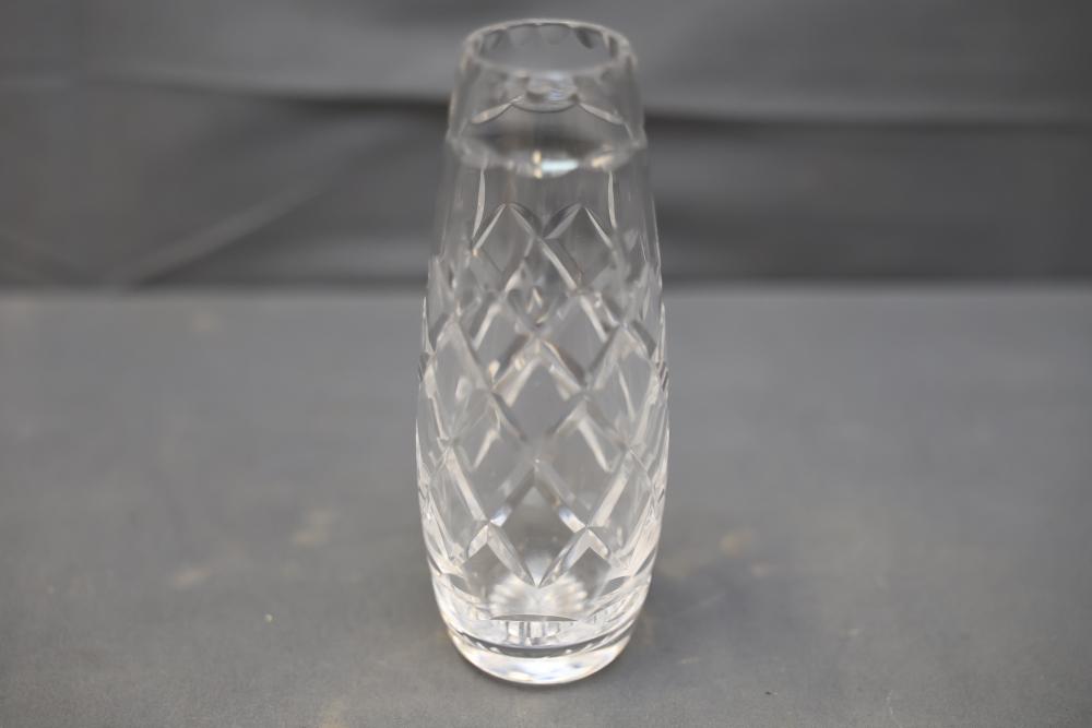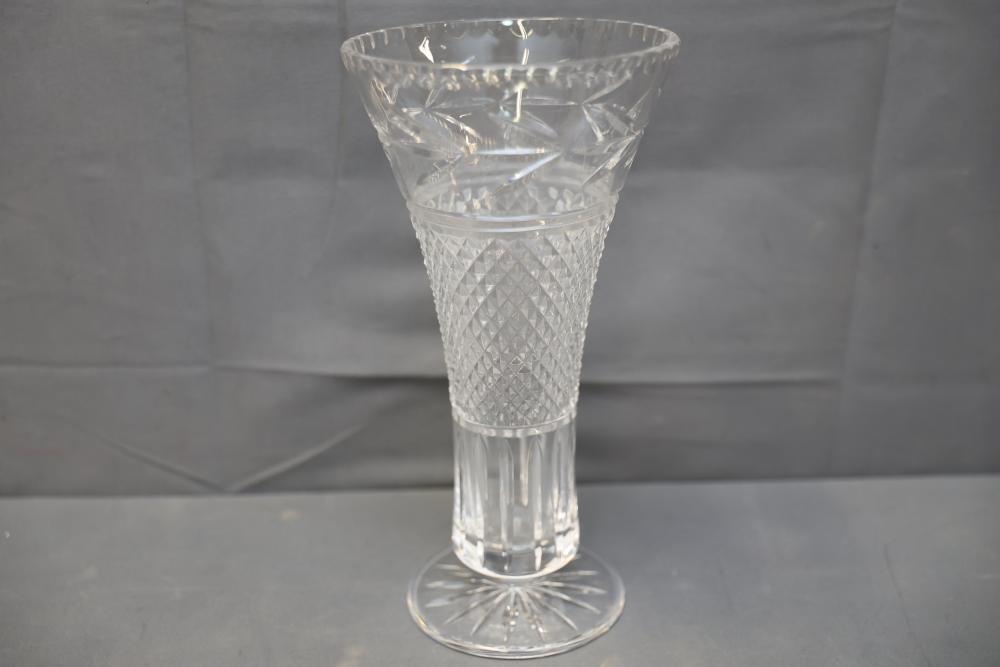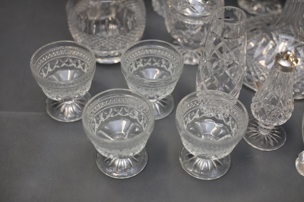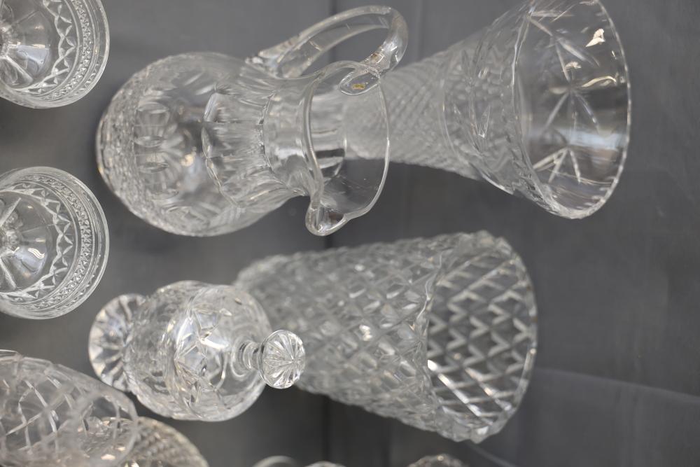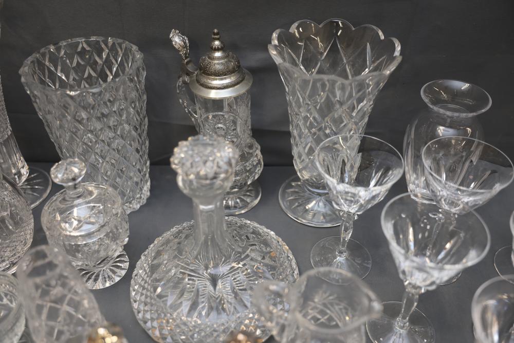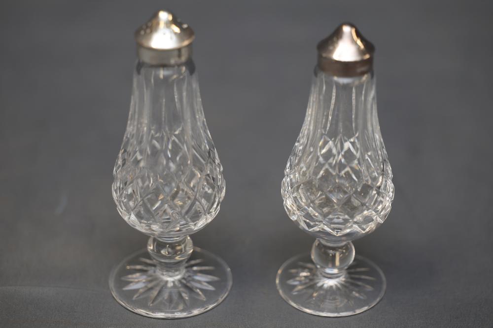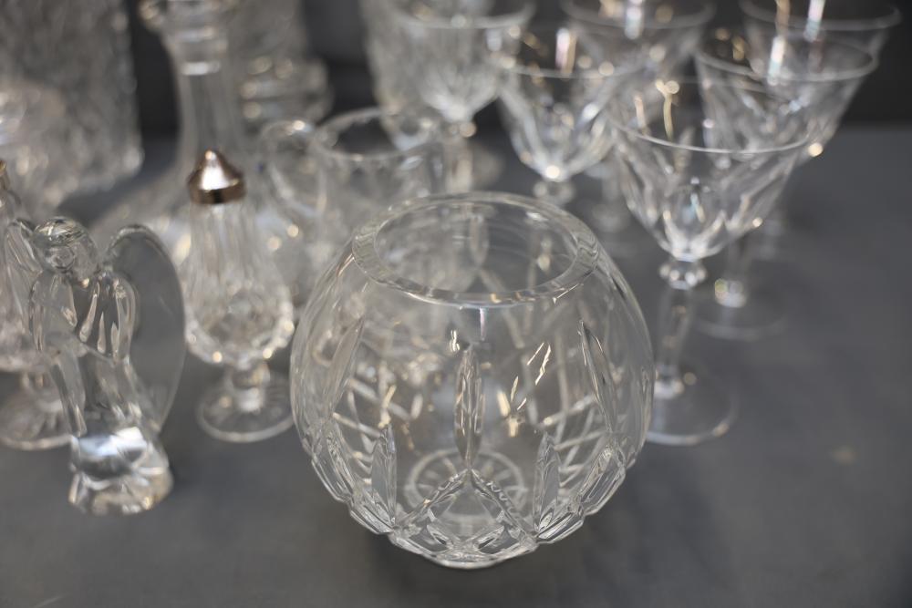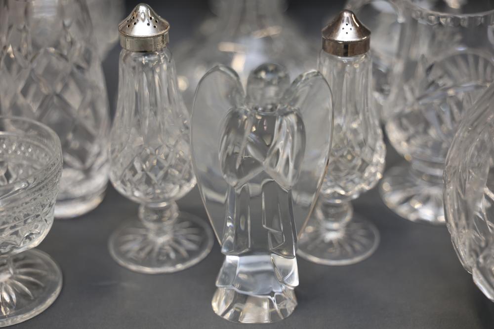 Waterford Crystal Shakers and Assorted Crystal Glassware. Includes a pair of Waterford crystal salt and pepper shakers and a variety of cut-crystal items such as vases, a decanter, stemware, decorative pieces, and more. Pieces feature intricate designs and a polished finish. Pickup only.