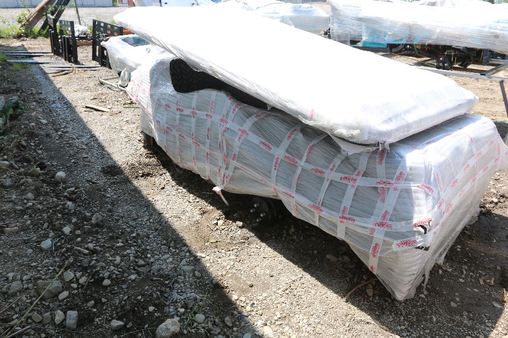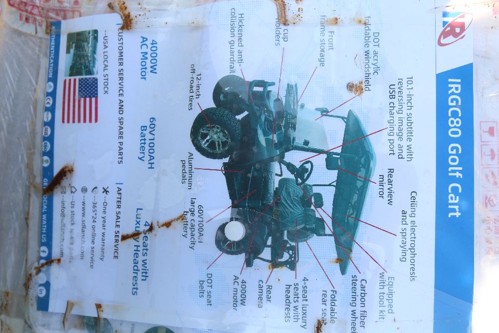 New 2025 Grey Electric Four Person Golf Cart Model IRGC80 with 4KW AC Motor. Features include a rear camera, LED display, foldable rear seats, a canopy cover, and a DOT foldable acrylic front windshield. Equipped with DOT seatbelts, carbon fiber steering wheel, and 12-inch off-road tires. The cart has a top speed of 23-24mph and includes a 60V100AH battery. Item is disassembled but appears complete. Pickup only.