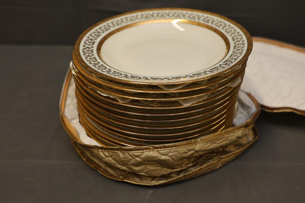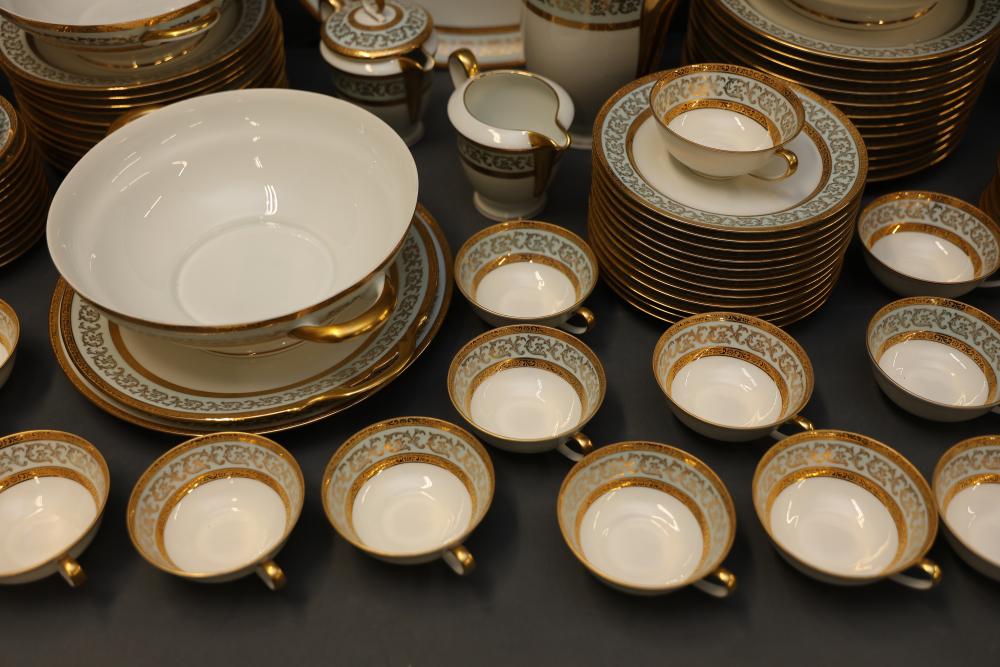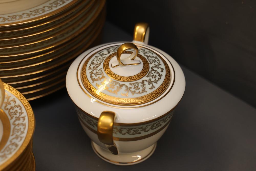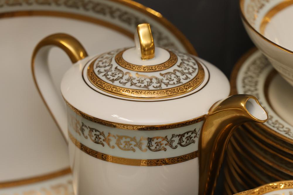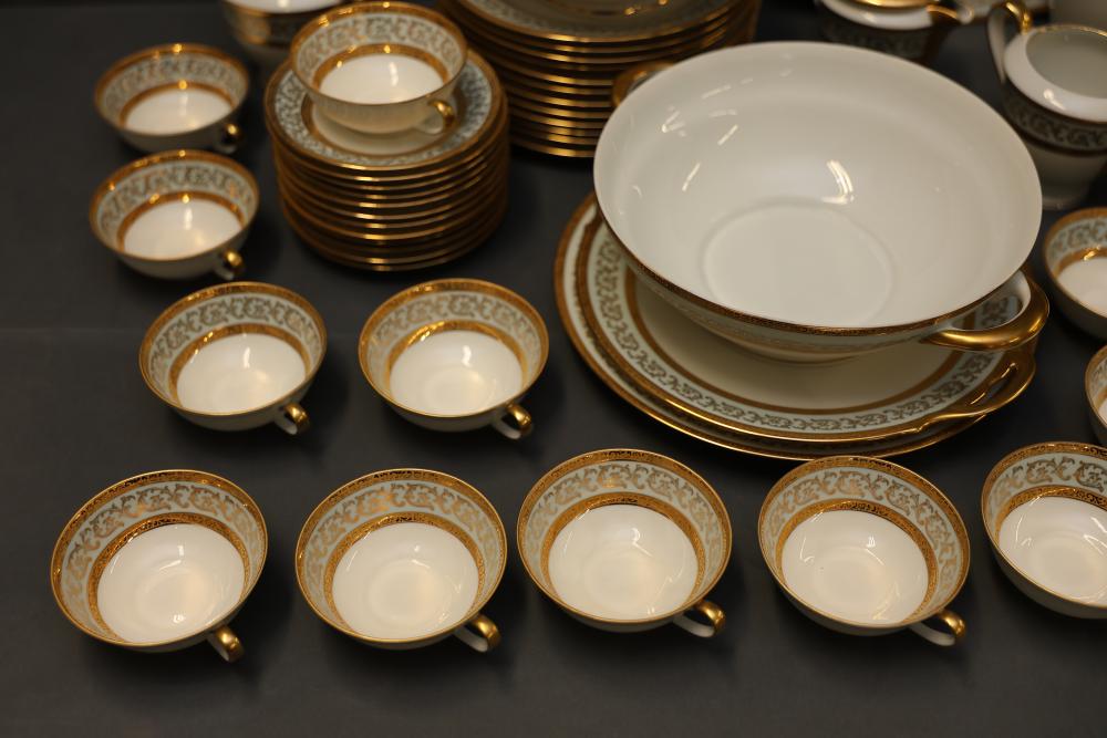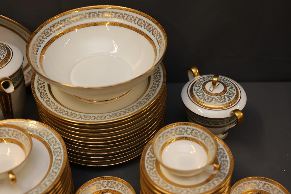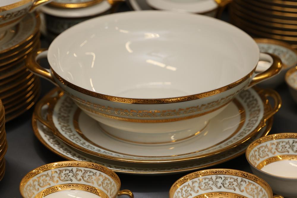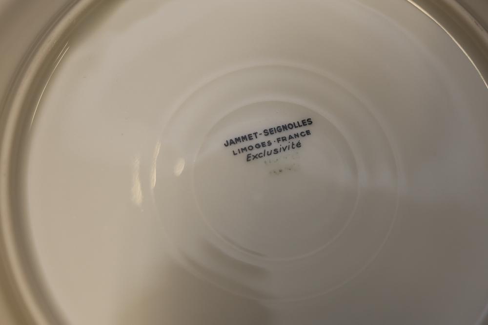 Jammet-Seignolles Limoges Exclusive White and Gold Porcelain Dinnerware Set. Includes plates, bowls, teacups with saucers, serving bowls, coffee pot, creamer, and sugar dish. Decorated with intricate gilt details and a patterned rim design. Marked 'Jammet-Seignolles Limoges-France Exclusive.' Includes storage case for plates. Pickup only.