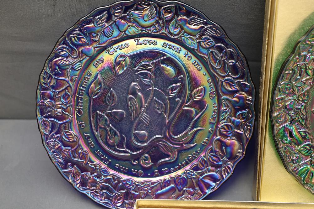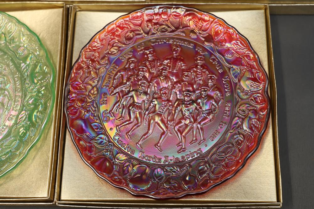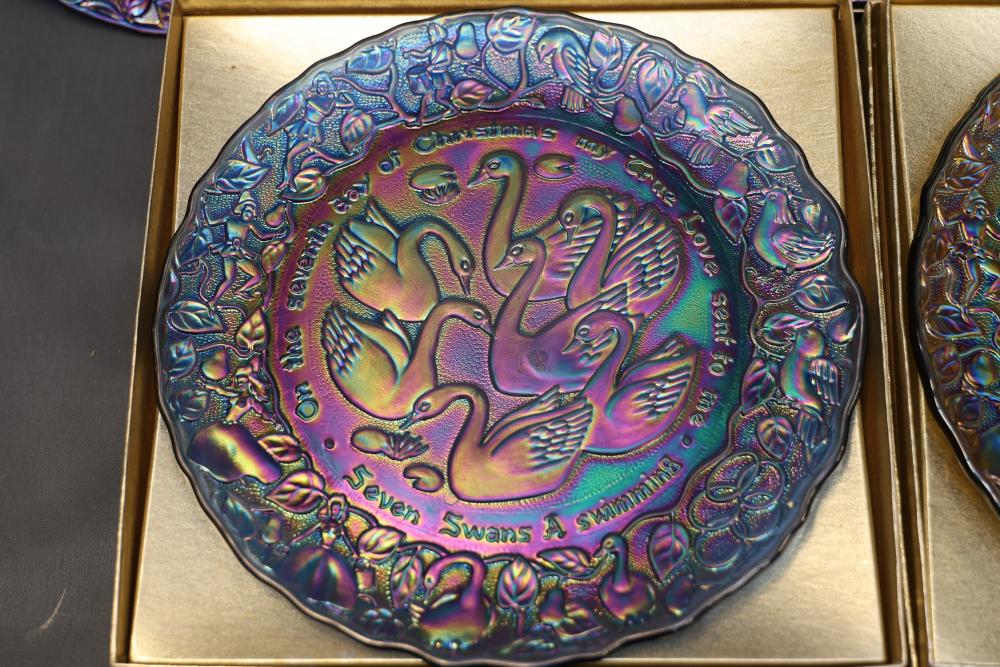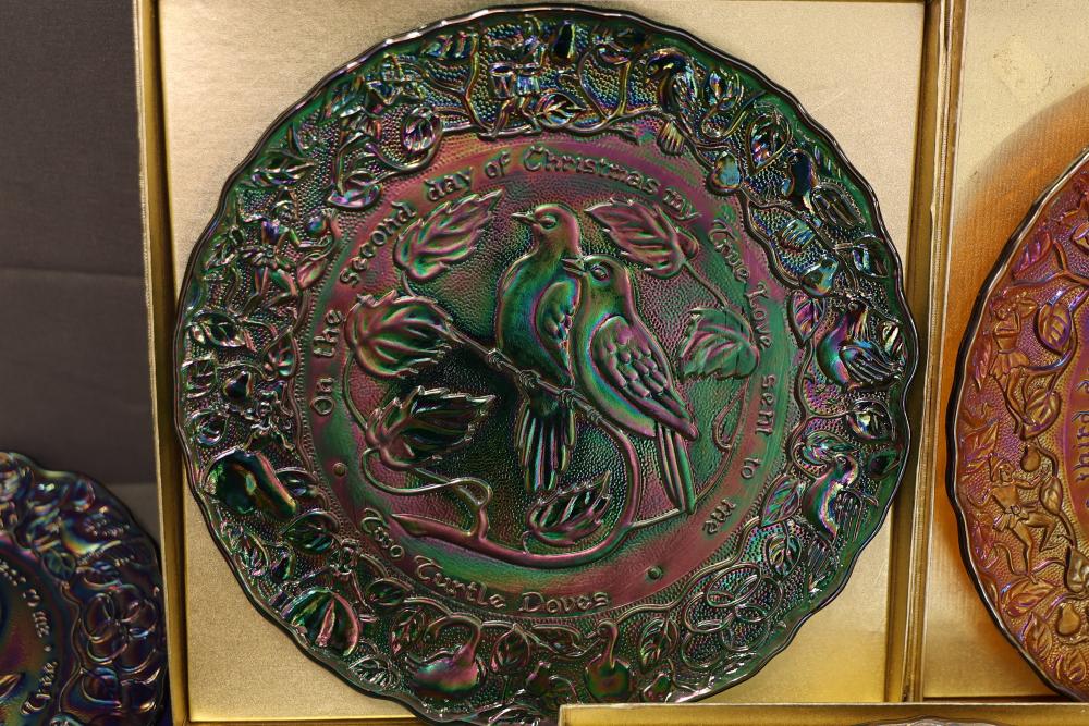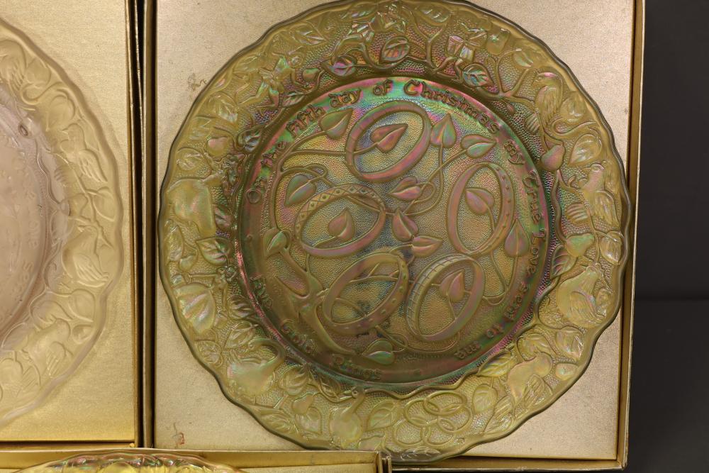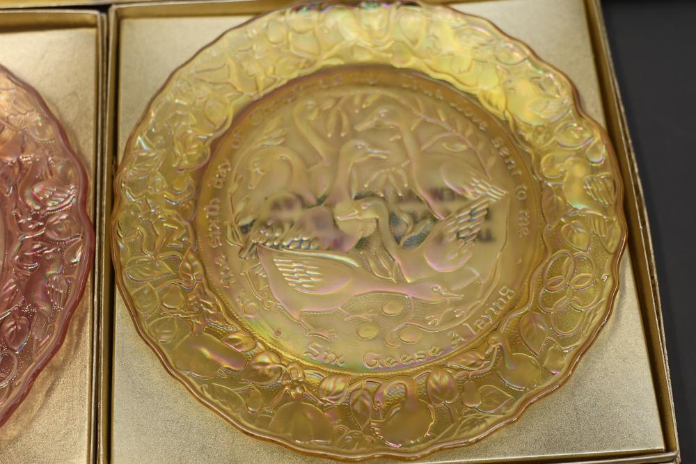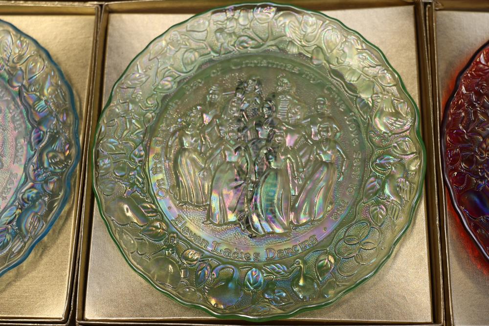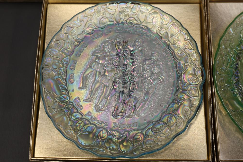 12 Imperial Glass 'Twelve Days of Christmas' collector plates made of iridescent glass. Each plate is intricately embossed with designs representing lyrics from the traditional Christmas carol, such as 'Eleven Ladies Dancing' and 'Seven Swans A-Swimming.' Includes original labels and packaging, as shown. Pickup only.