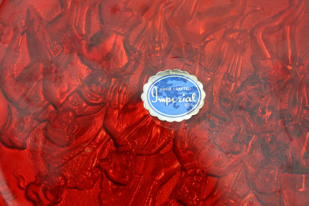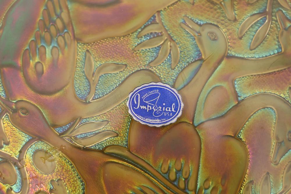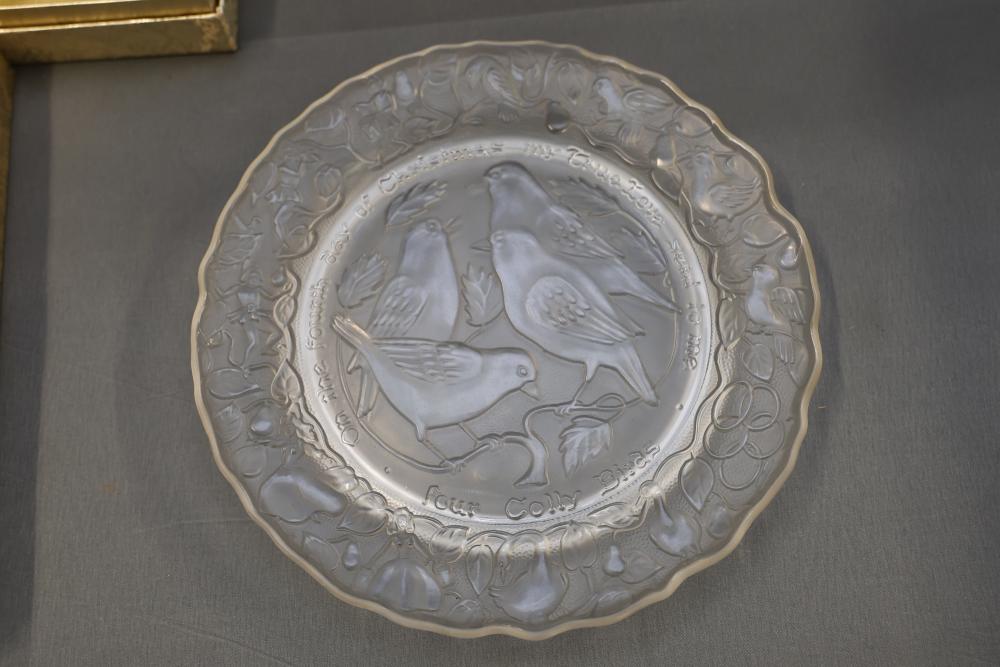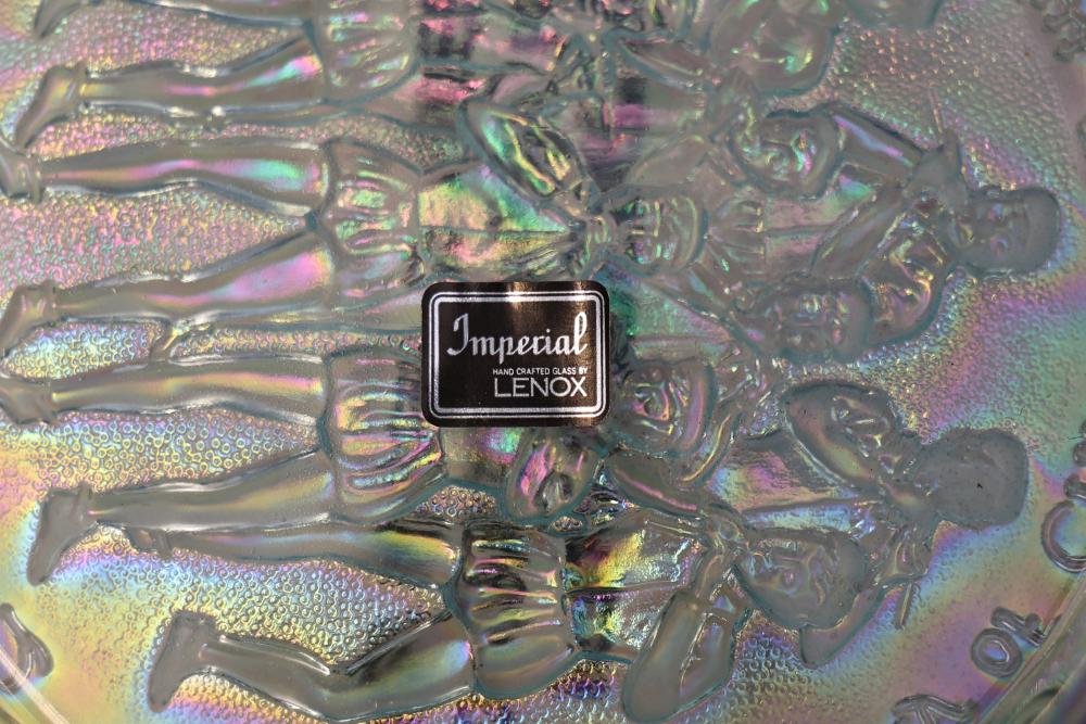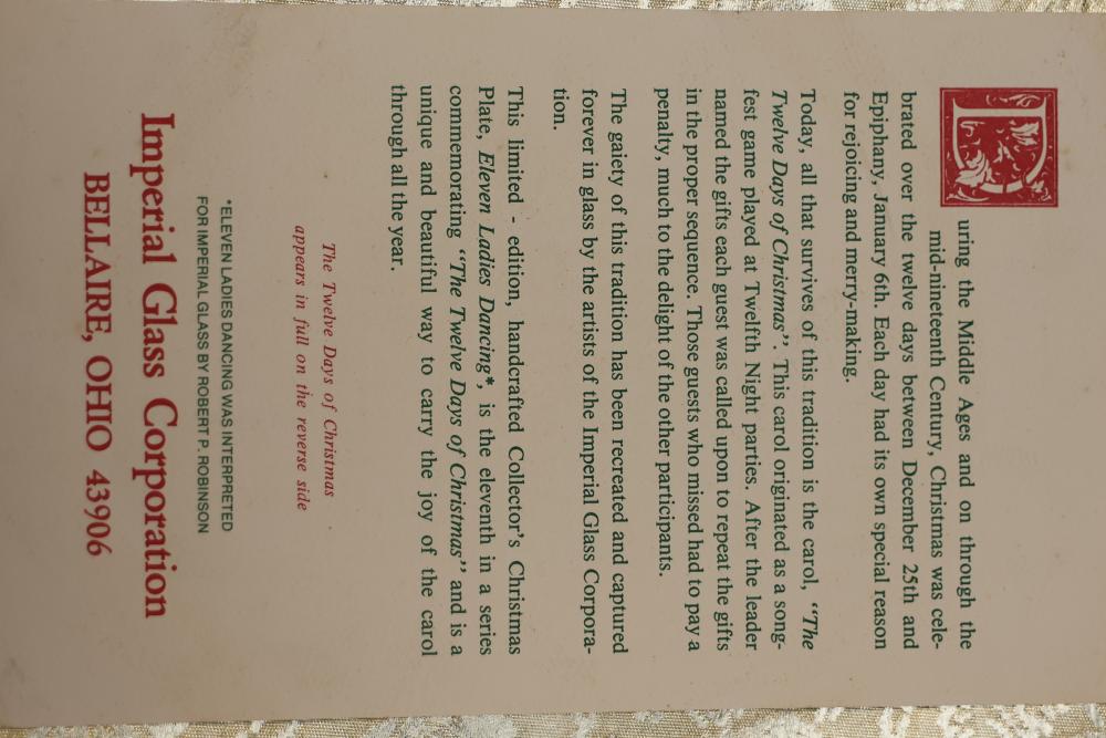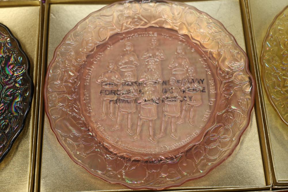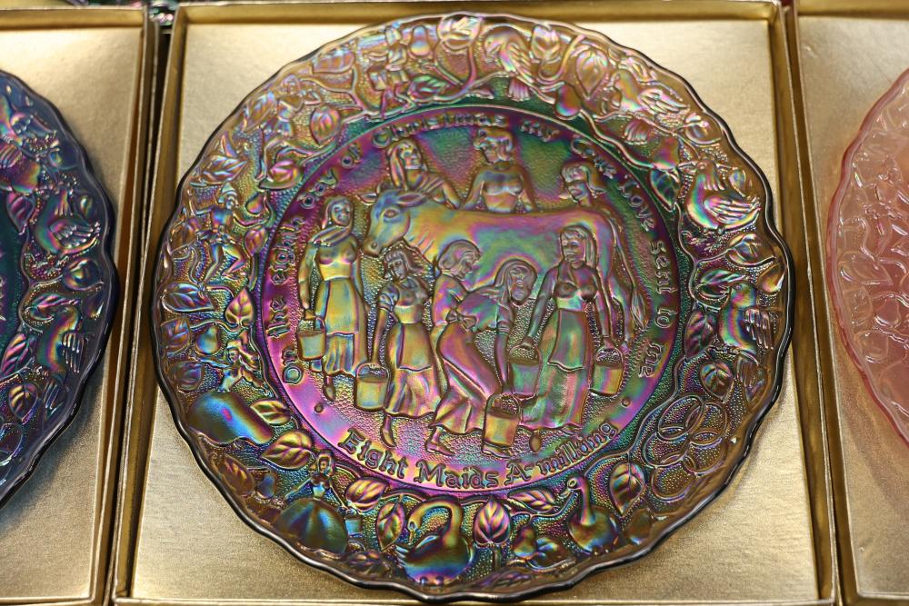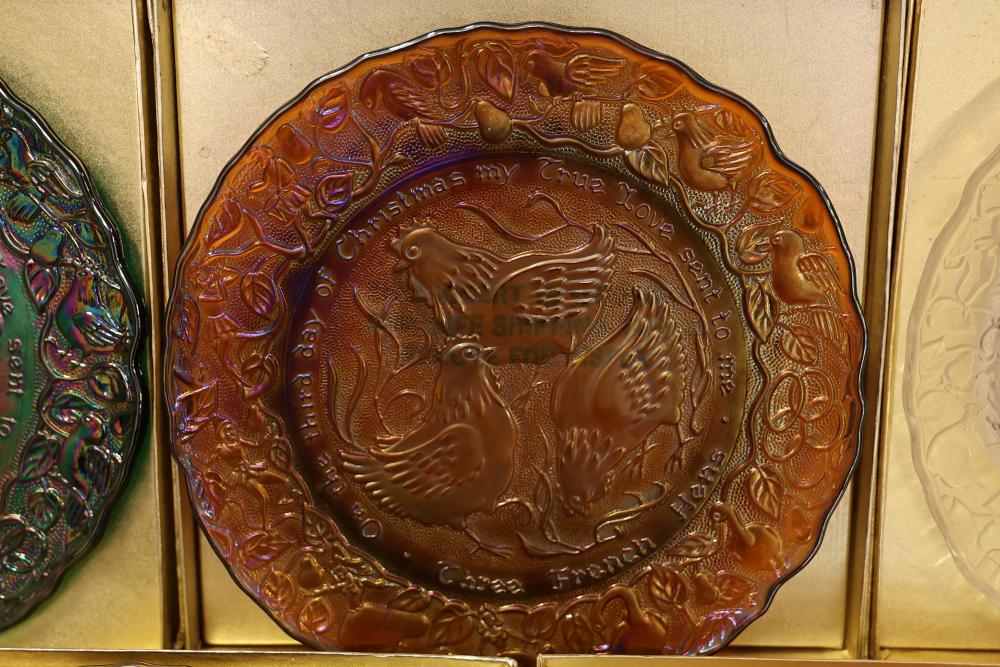 12 Imperial Glass 'Twelve Days of Christmas' collector plates made of iridescent glass. Each plate is intricately embossed with designs representing lyrics from the traditional Christmas carol, such as 'Eleven Ladies Dancing' and 'Seven Swans A-Swimming.' Includes original labels and packaging, as shown. Pickup only.