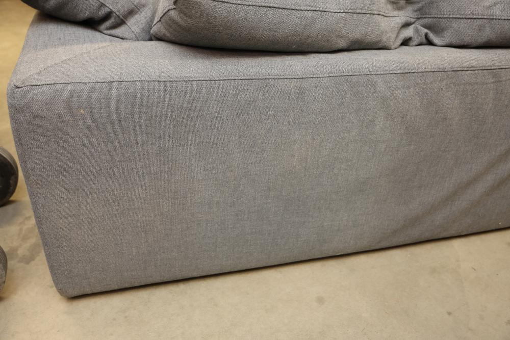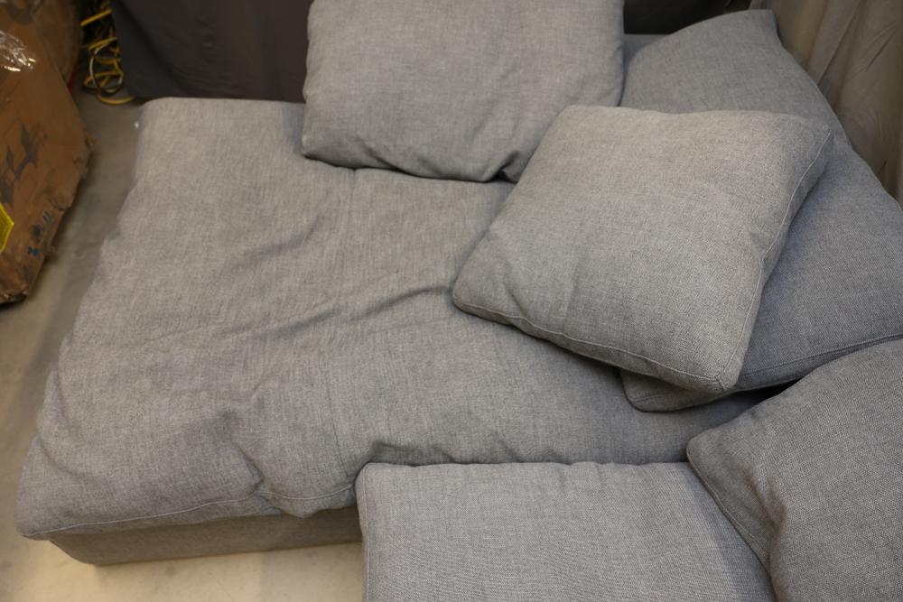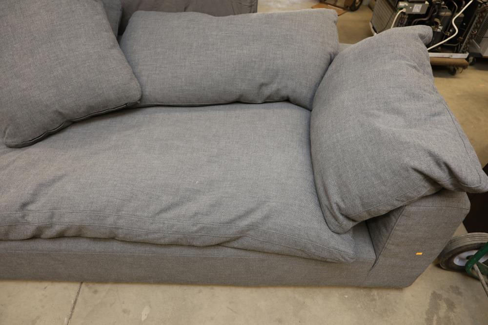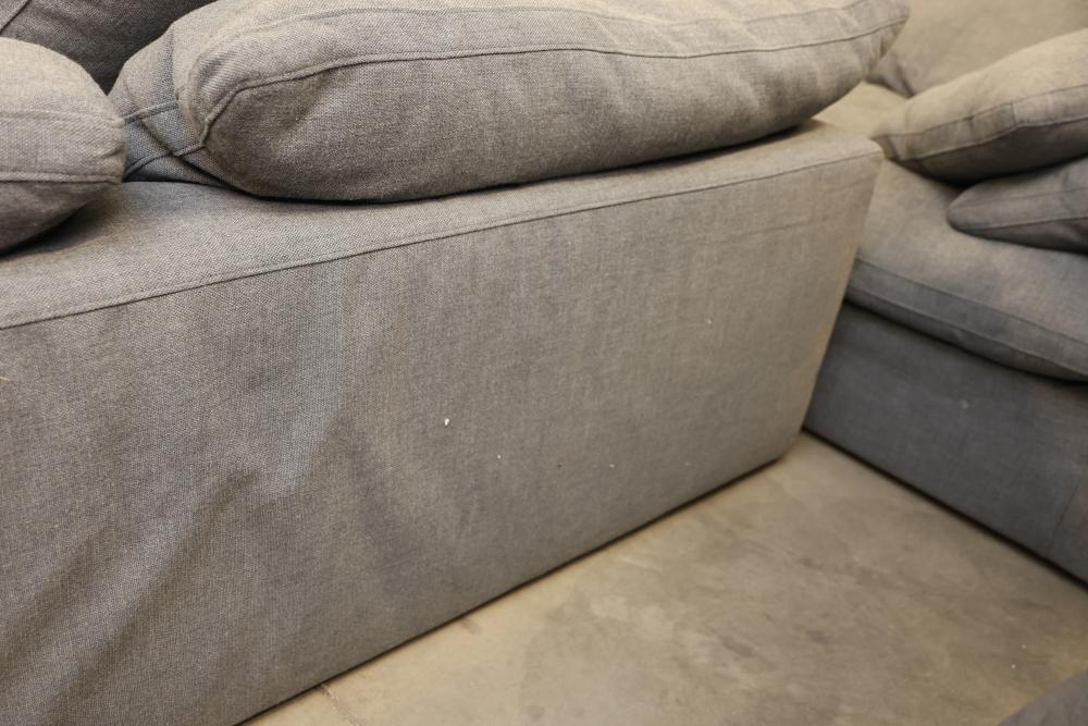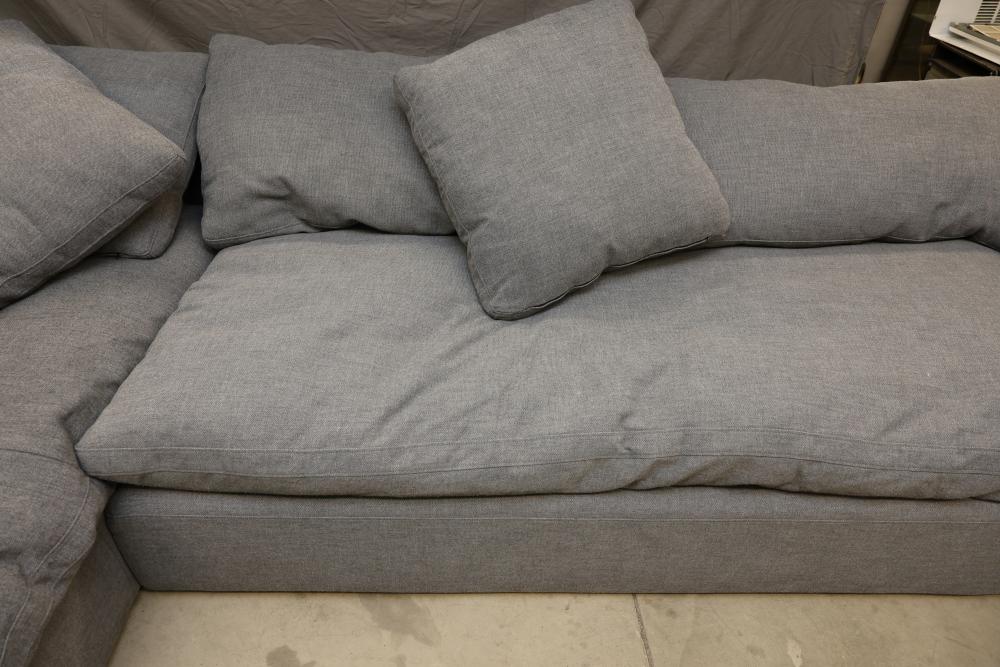 RH Gray Upholstered Sectional Sofa With Loose Cushions. This sectional sofa features a gray fabric upholstery, loose cushions, and modular design for versatile use. Ideal for comfortable seating and lounging. 159"L Pickup only.