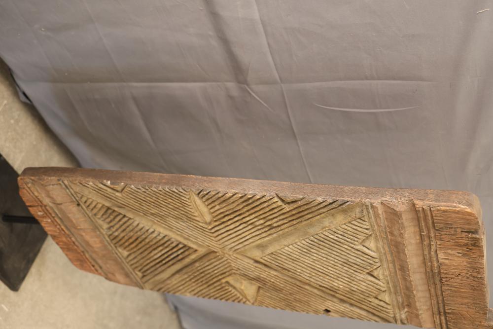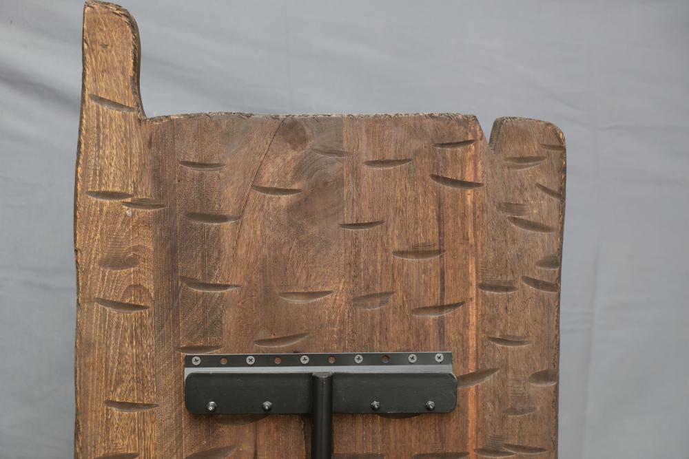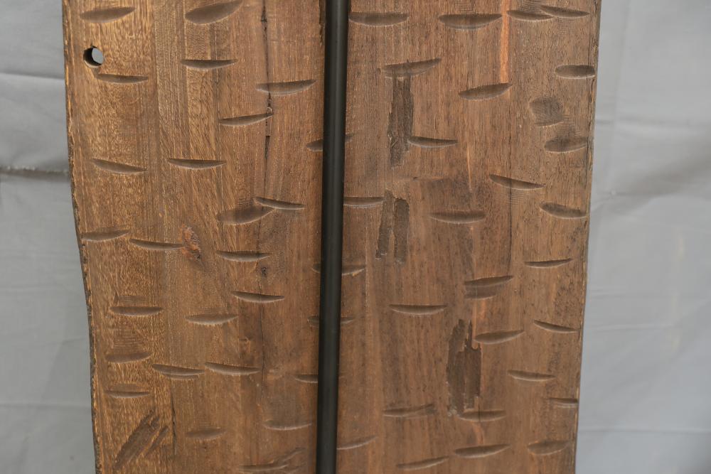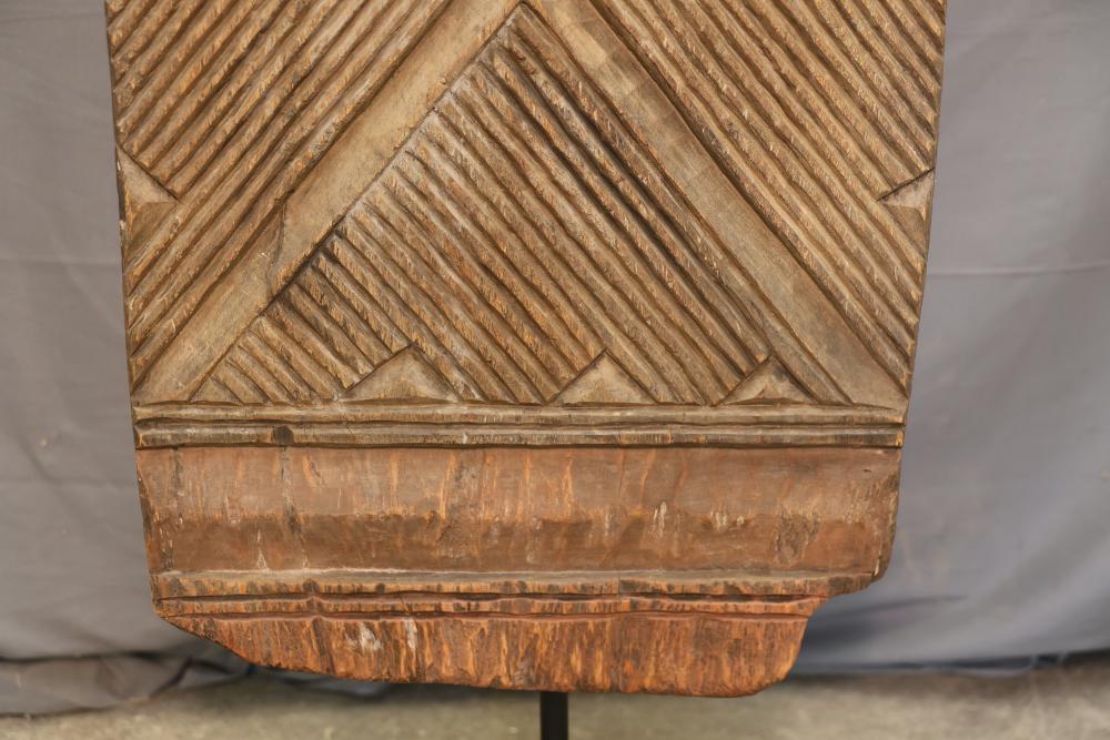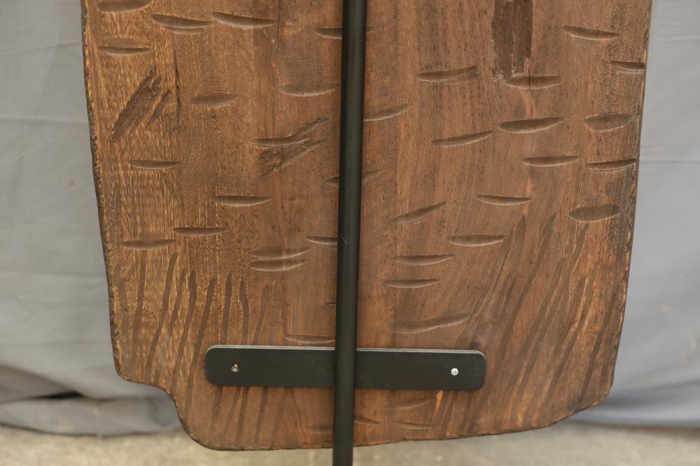 Hand-Carved Wooden Panel With Geometric and Textured Design on Display Stand. Features intricate carvings on one side with a geometric pattern and textured detailing, while the reverse side shows a textured carved pattern. Mounted on a black metal display stand for presentation. 46"x18". Pickup only.