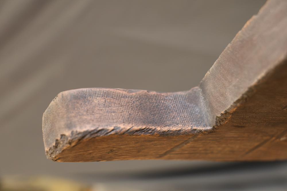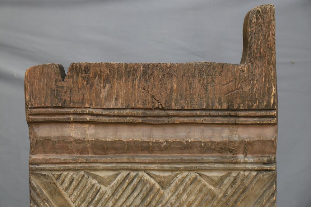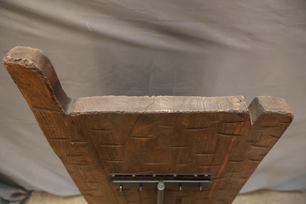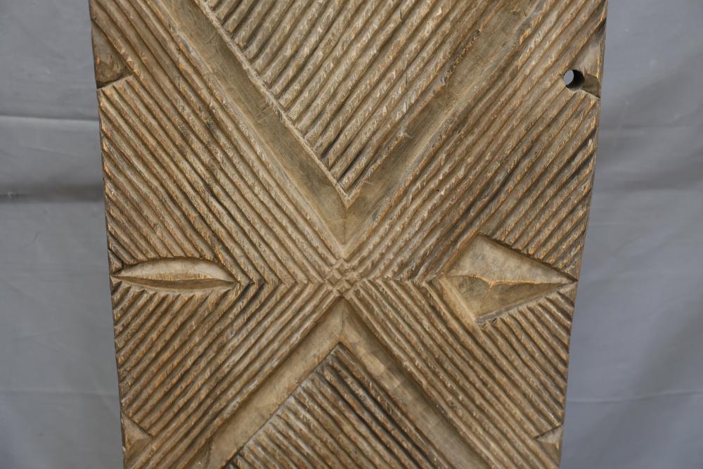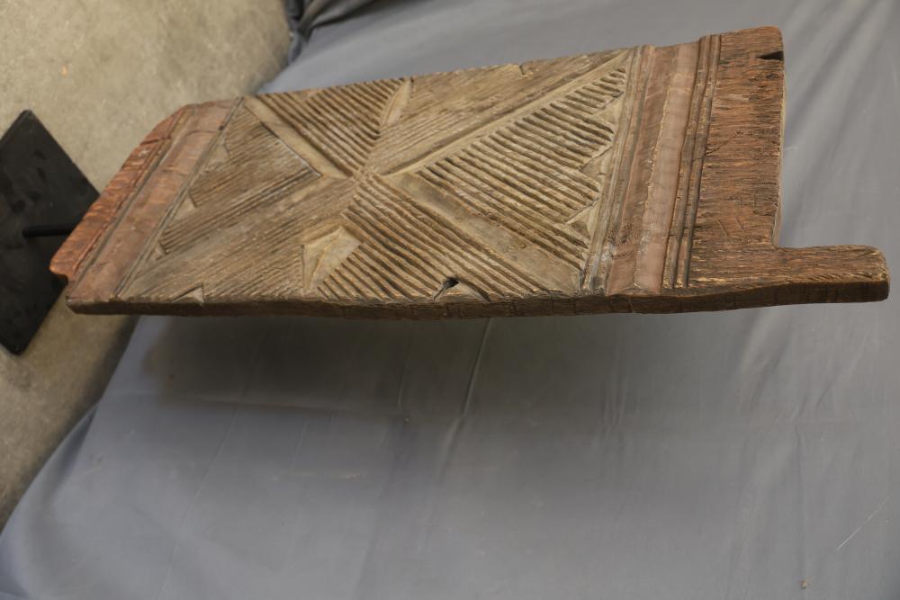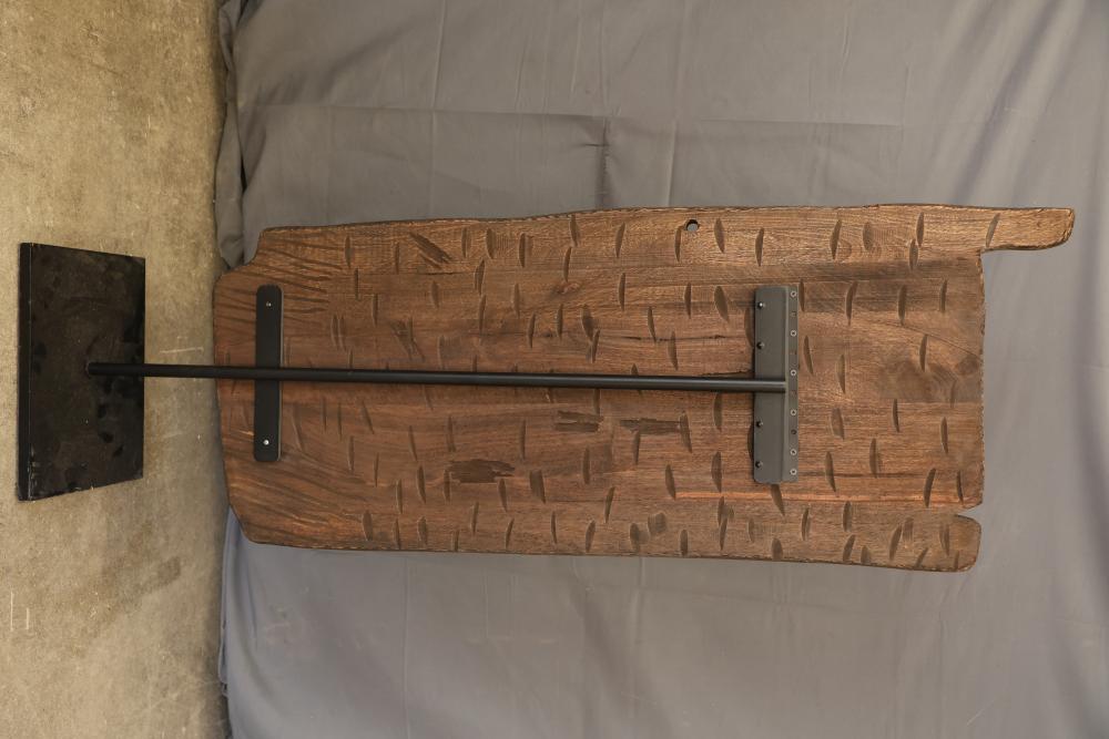 Hand-Carved Wooden Panel With Geometric and Textured Design on Display Stand. Features intricate carvings on one side with a geometric pattern and textured detailing, while the reverse side shows a textured carved pattern. Mounted on a black metal display stand for presentation. 46"x18". Pickup only.