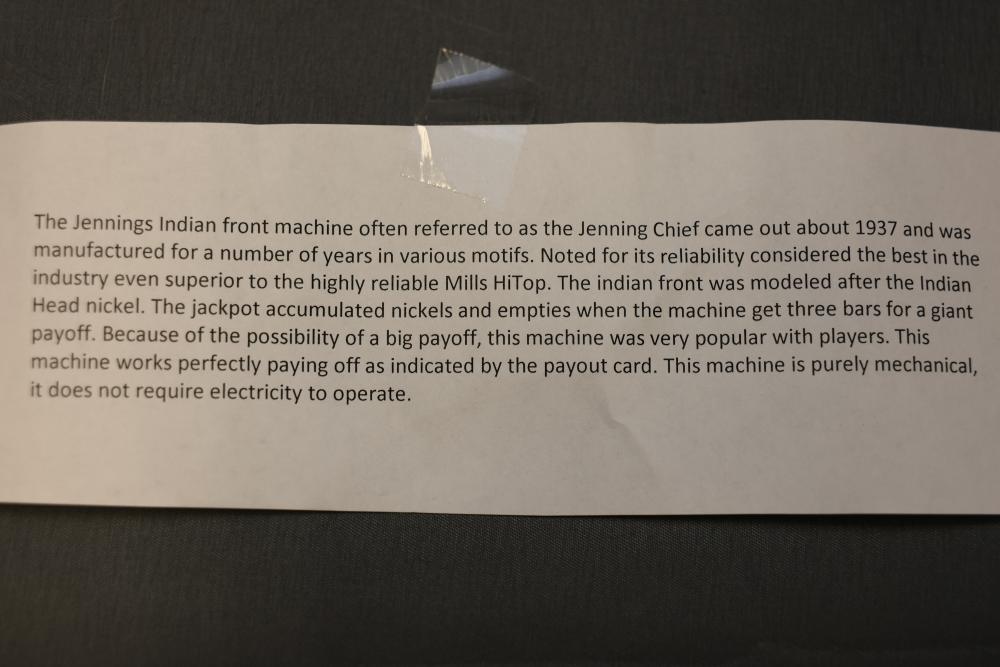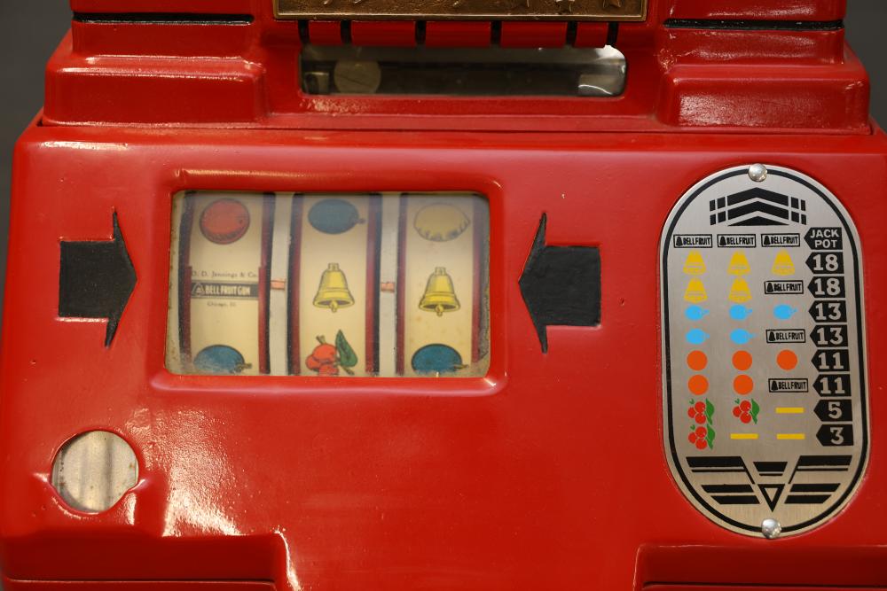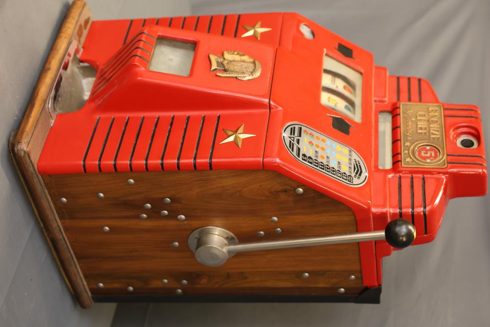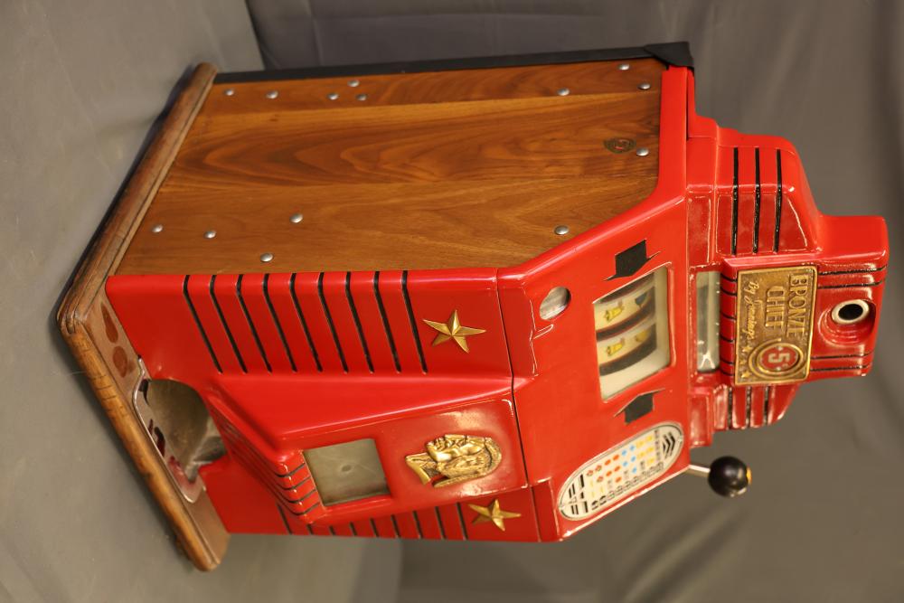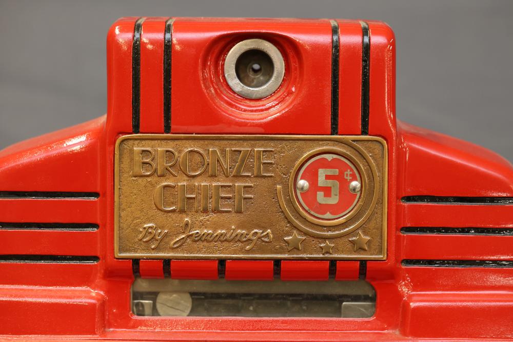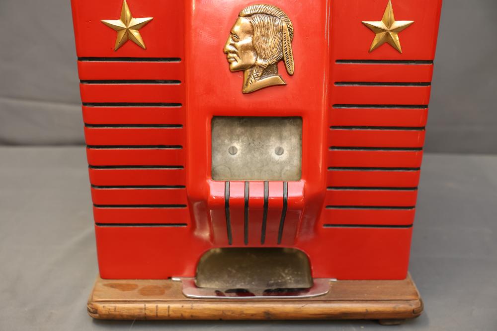 Jennings Bronze Chief 5-Cent Slot Machine featuring a red exterior with painted black and gold star accents and a front plaque displaying 'Bronze Chief by Jennings.' Includes a mechanical lever and wooden base. Interior mechanism is visible and includes instructional care sheet. Accessories include a metal coin box and payout card reel. Mechanically operated and designed for nickel play. Pickup only.