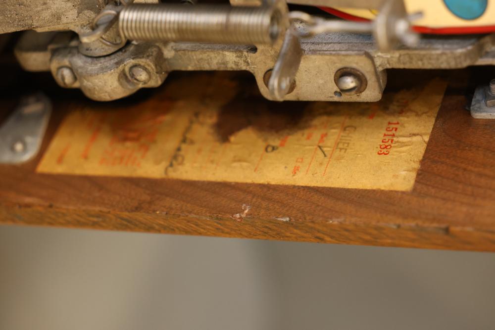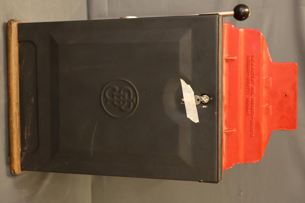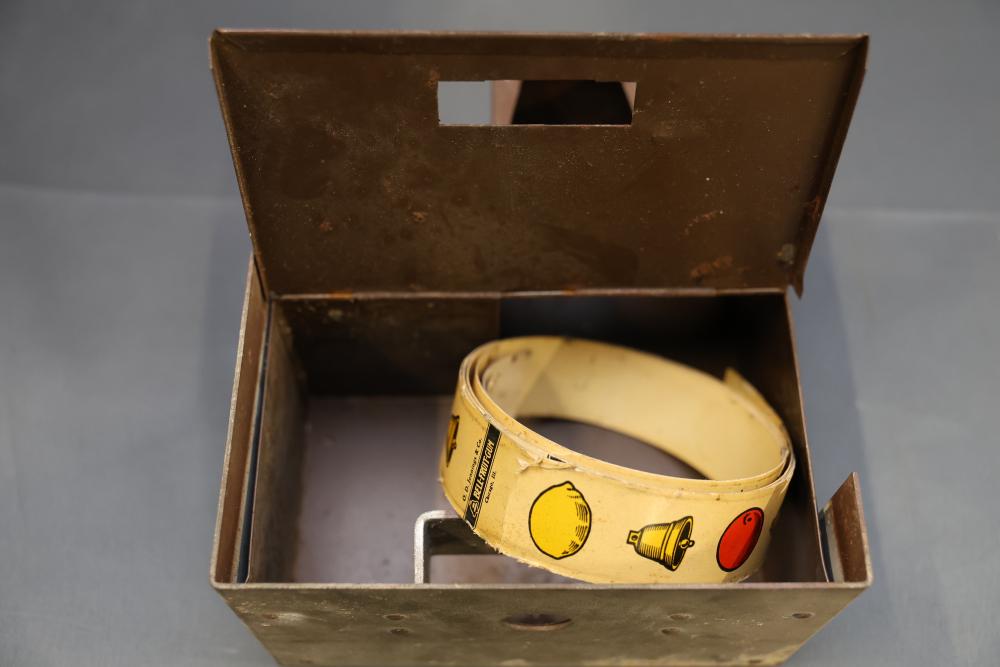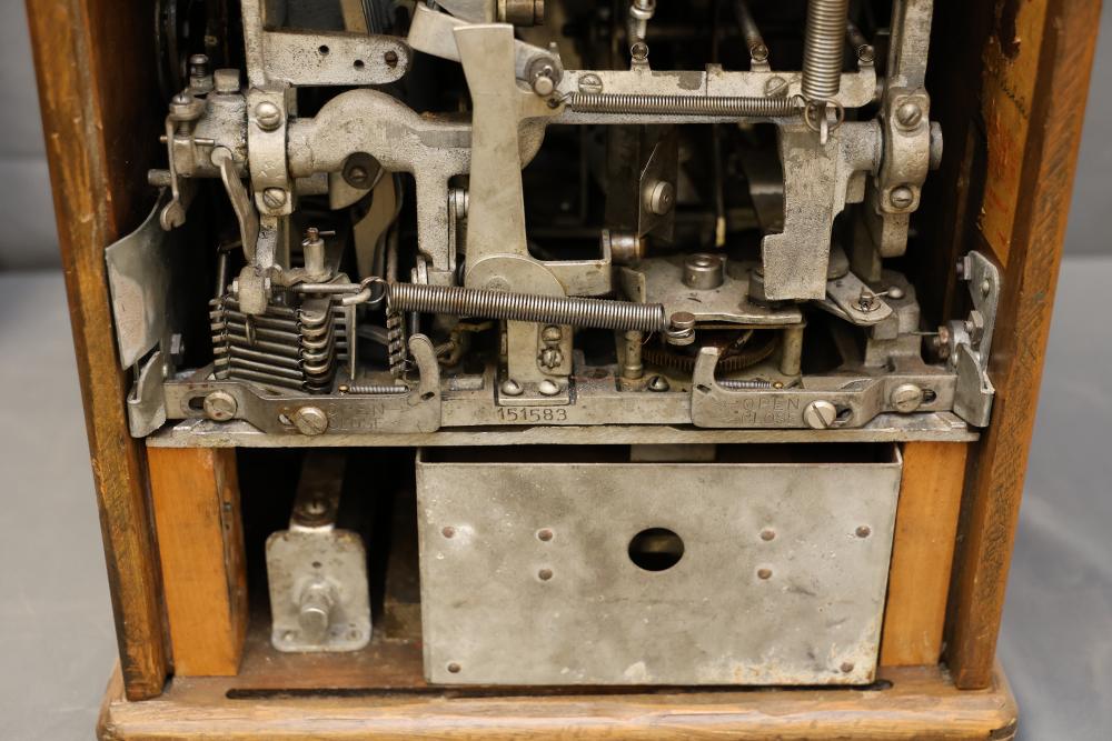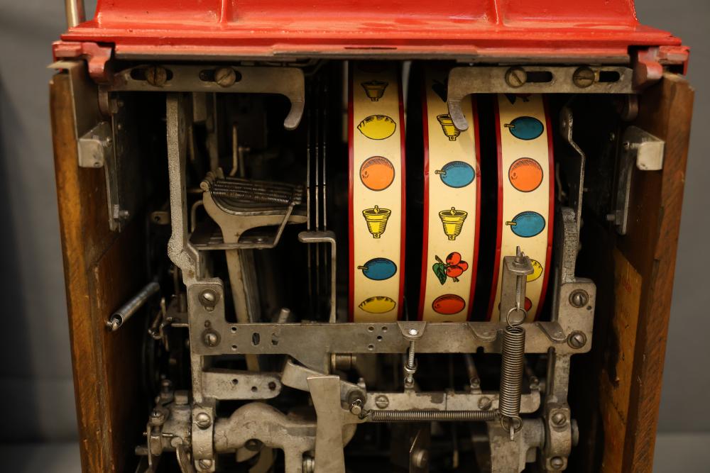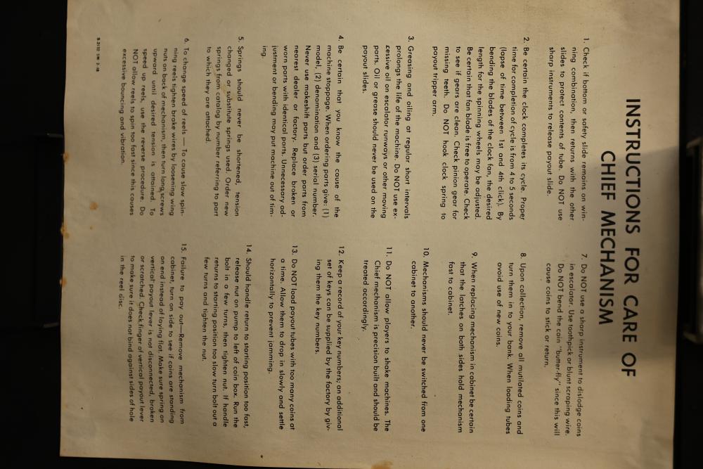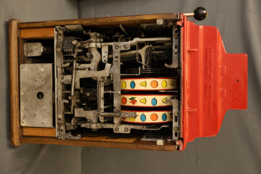 Jennings Bronze Chief 5-Cent Slot Machine featuring a red exterior with painted black and gold star accents and a front plaque displaying 'Bronze Chief by Jennings.' Includes a mechanical lever and wooden base. Interior mechanism is visible and includes instructional care sheet. Accessories include a metal coin box and payout card reel. Mechanically operated and designed for nickel play. Pickup only.