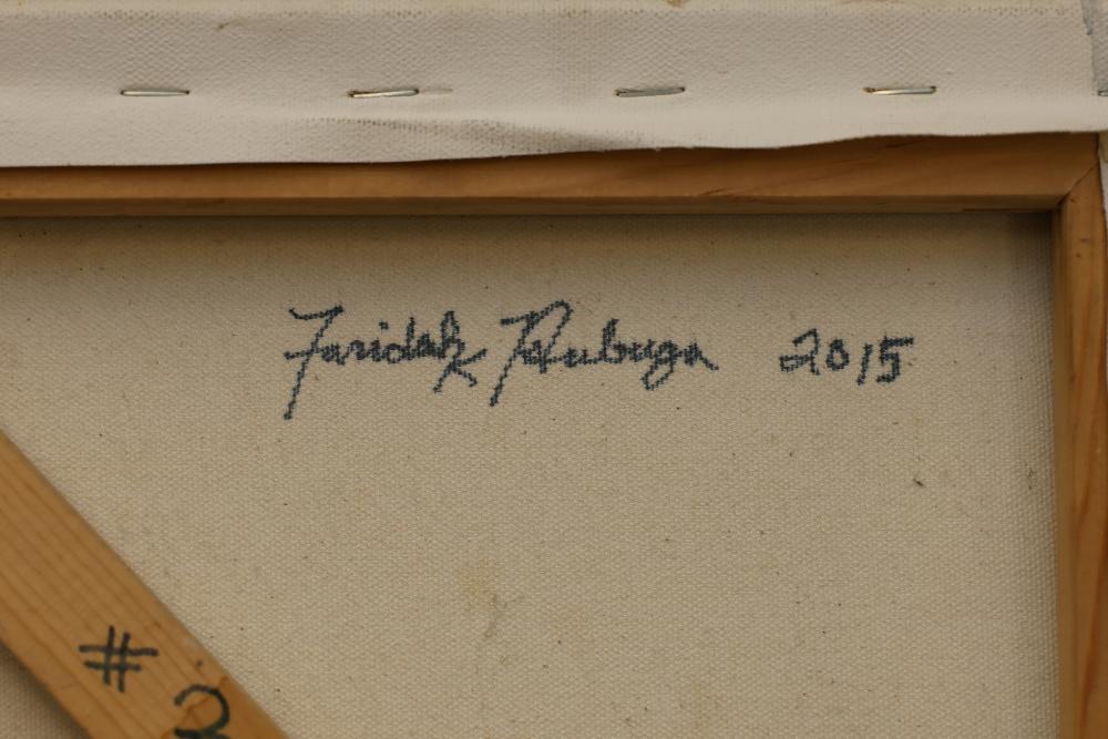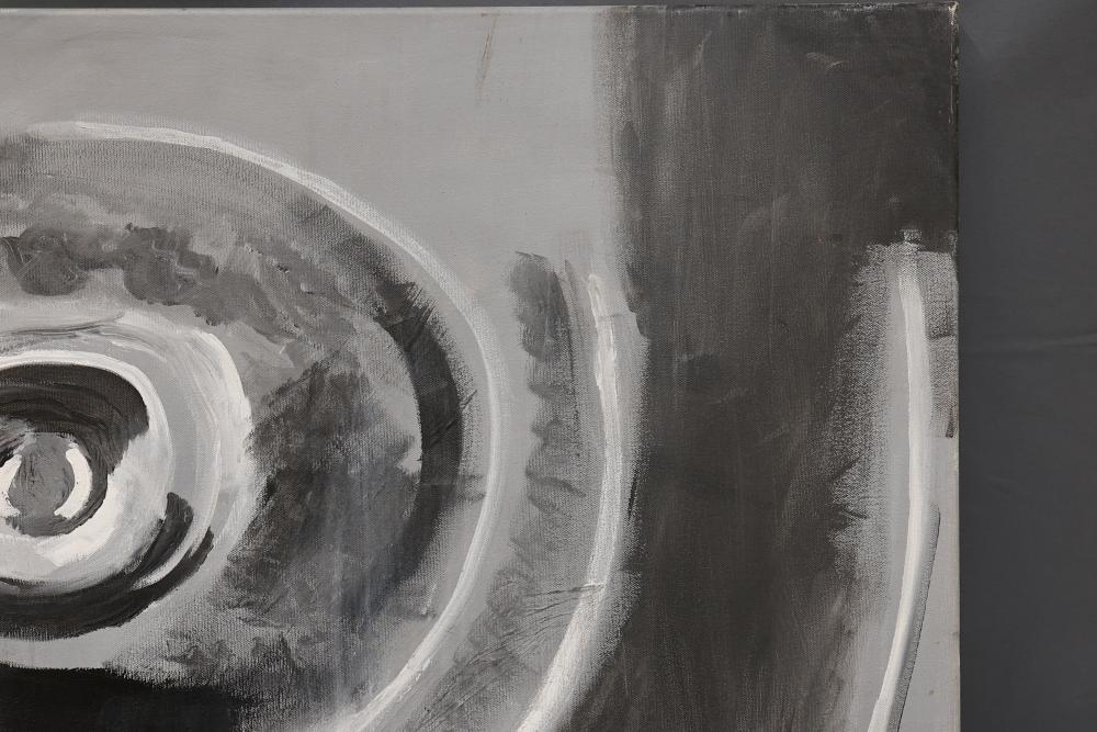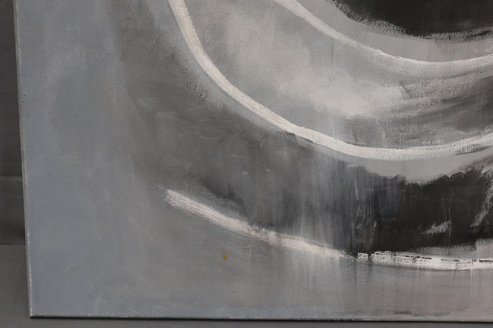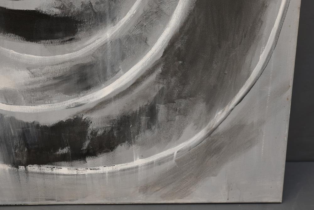 Faridah Nsubuga 2015 'Confusion' Acrylic on Canvas Painting. Abstract composition featuring concentric swirling forms in shades of black, white, and gray. Signed and dated on the back of the canvas. Canvas is stretched over a wooden frame. Minor wear visible on edges. Pickup only.