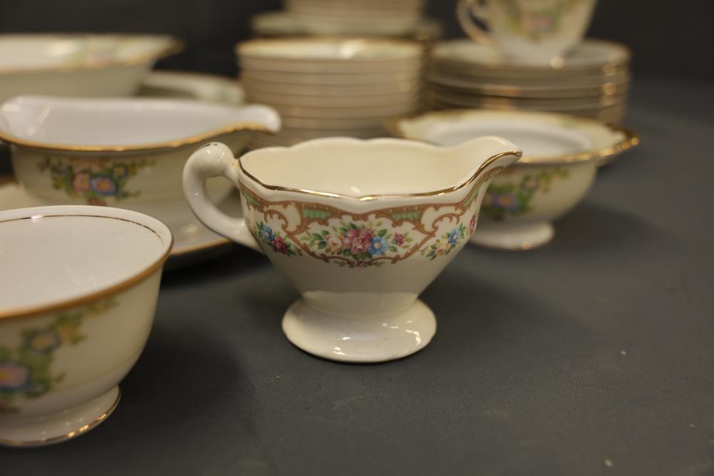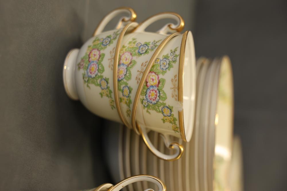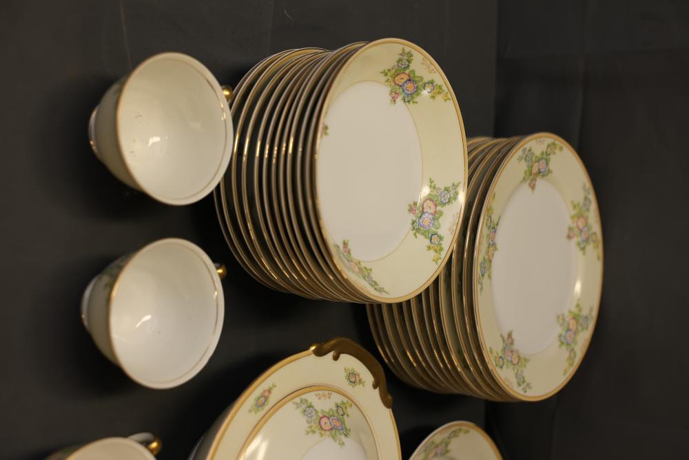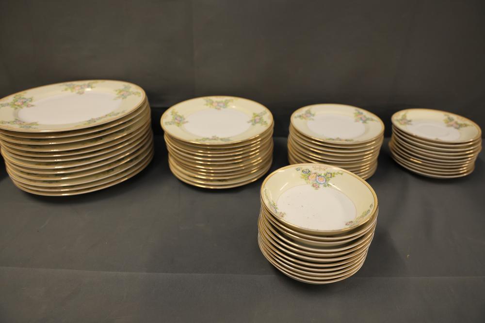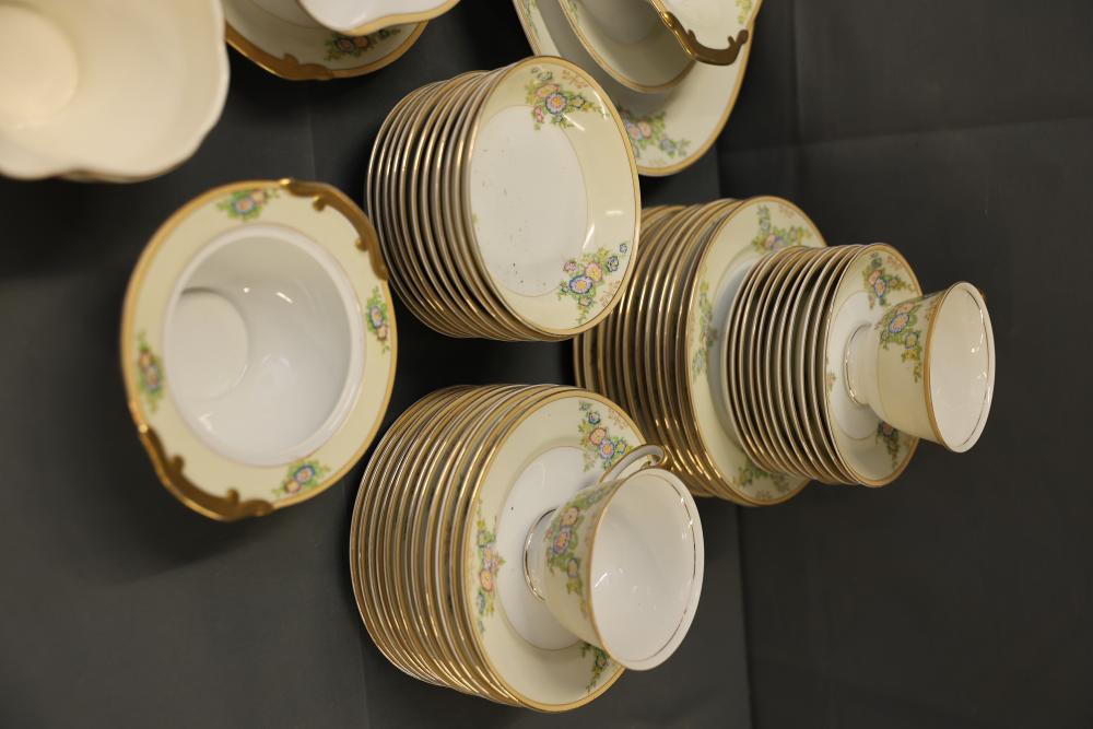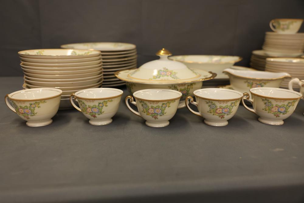 Noritake China Set with Floral and Gold Accents. A matching set of fine china featuring floral designs and gold accents. The set includes various plates, cups, bowls, serving pieces, and other items as shown in the images. Appears in used condition with wear consistent with use and age. Pickup only.